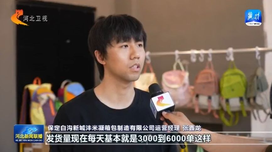 在白沟新城的一家箱包直播间里,主播正在镜头前展示新款背包,打印机则在一旁不停出单。