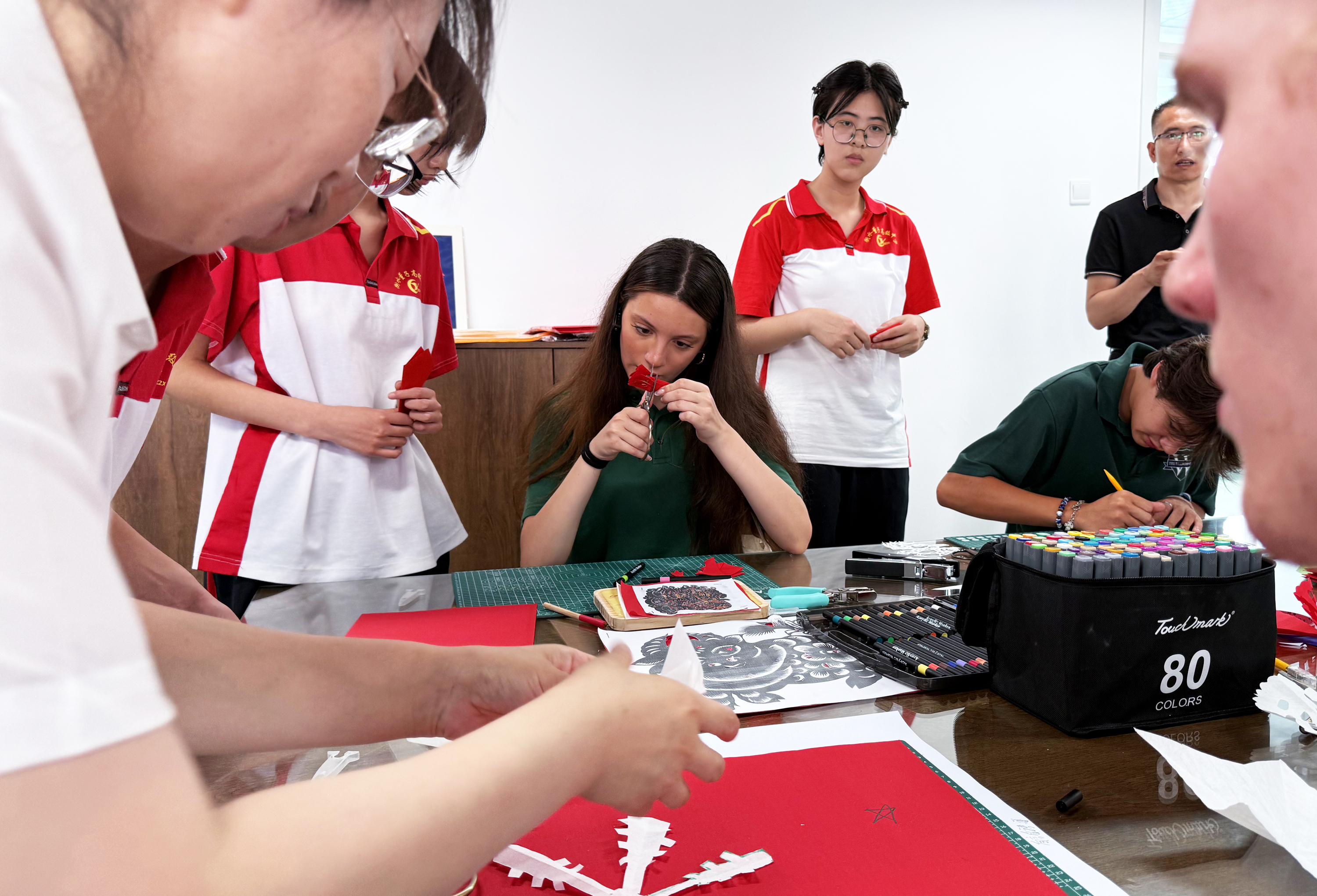 6月19日,交流团抵达河北枣强中学。校方以腰鼓、舞龙舞狮等传统民俗表演热情迎接。在开放式课堂环节,校方代表详细介绍学校教育理念与办学成果,并组织大家参观筑梦园、校史馆。美方学生还参与了剪纸、漆扇、面人等特色社团课程。来自美国加利福尼亚州的学生Truman Skoy(黄珈磊)兴奋地说:“这次交流活动非常精彩,中国不仅自然风光秀丽,民众也十分友善。”在“分享青春 共享未来”主题交流中,中美学生围绕文化传承展开探讨:美方分享感恩节社区活动,中方展示书法作品;在文体互动环节,篮球友谊赛混合组队竞技,艺术教室共同创作文化主题作品,充分展现文化交融成果。