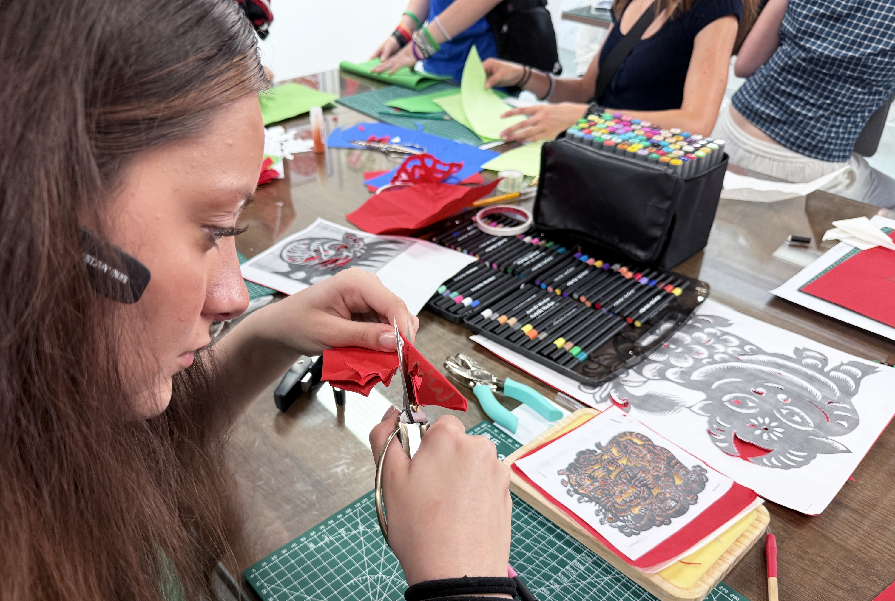 6月18日,活动首日,交流团与当地的小学生开展志愿交流活动。现场,美方学生运用简单中文词汇配合生动的肢体语言,展示美国校园文化。双方还共同参与“你画我猜”趣味游戏,在轻松氛围中加深彼此认知。在国家级非物质文化遗产保护单位——武强年画博物馆,交流团系统学习武强年画的历史渊源与制作工艺,并亲手体验刻板印制流程。美国得克萨斯州的学生马肯齐·梅希·坎农(Makenzie Meche Cannon)感慨道:“年画中鲜活的人物形象仿佛在讲述历史故事,让人深切感受到中国传统文化的深厚底蕴。”
