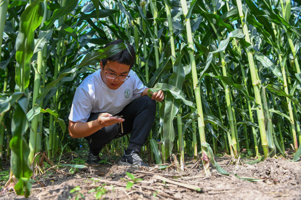 2023年7月31日,在位于吉林省四平市梨树县的中国农业大学“科技小院”保护性耕作试验田,一名学生查看玉米根部在黑土中的生长情况。