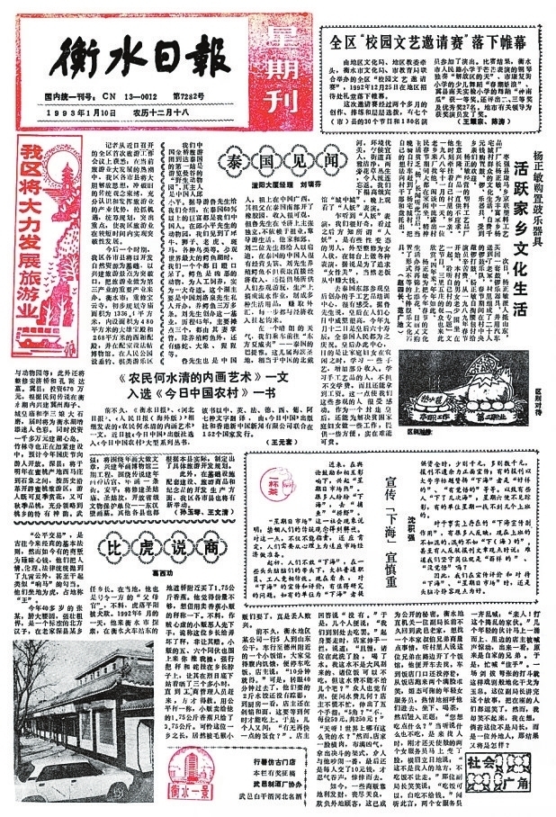 上世纪90年代,随着经济发展和旅游业服务进一步改善,国内游日益红火、出国游逐渐兴起。“春节前后,深县东四王村的村民们,一改过去走亲访友、备酒待客的老习惯,青年们或结伴相邀,或三五户合伙,包乘客运专车,络绎赴正定旅游。”这个村是有名的纺织配件专业村,人均收入在全县榜上有名。“富裕起来的村民们,对精神文明的追求也从内向型的自我完善转到去外界拓宽视野”(1992年3月1日1版);衡水市五交化公司对超额完成任务的门店经理、柜台组长,给予到新加坡、泰国等地13日旅游的奖励,5名职工领到了出国旅游护照(1993年3月20日1版)。