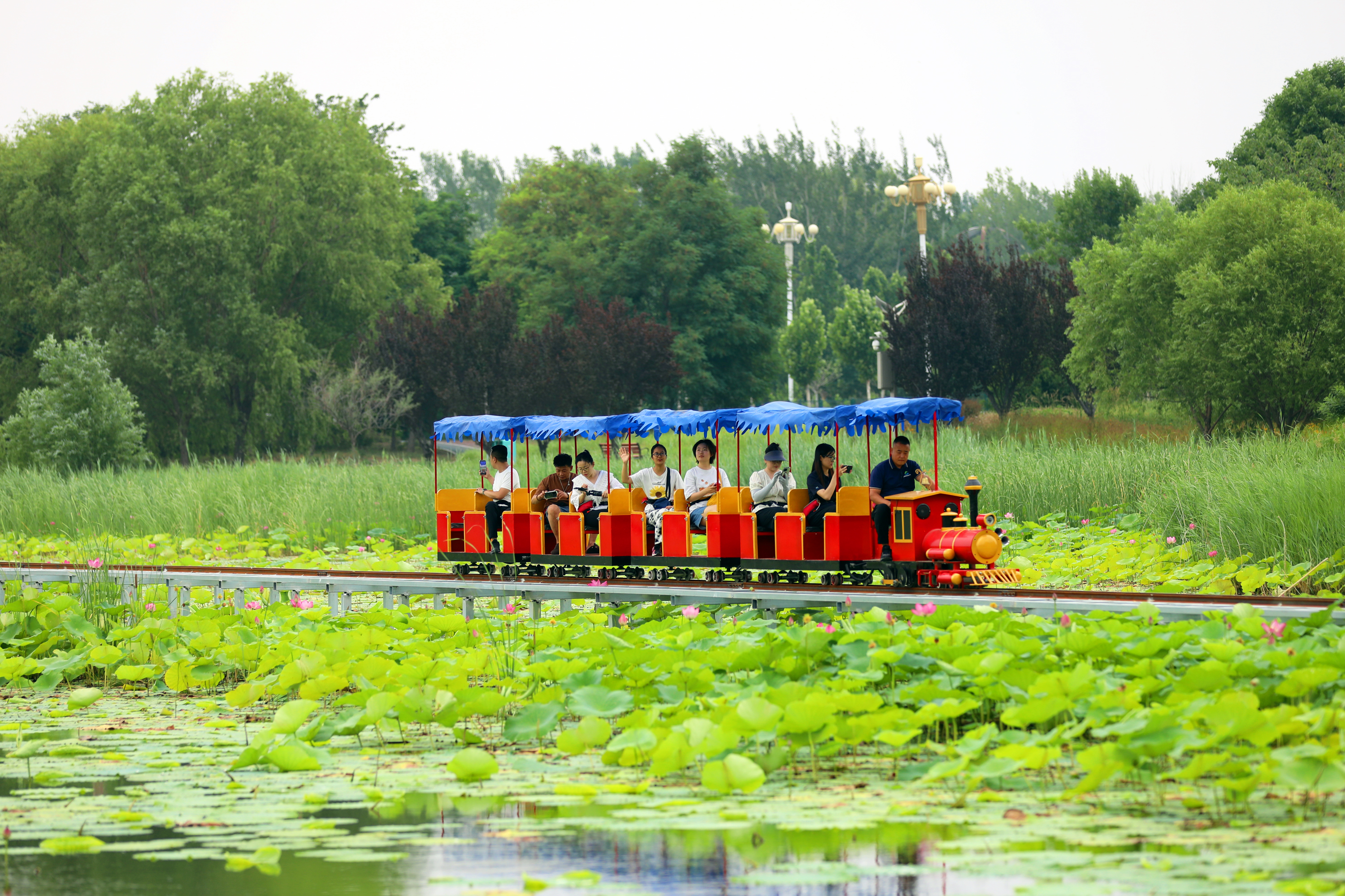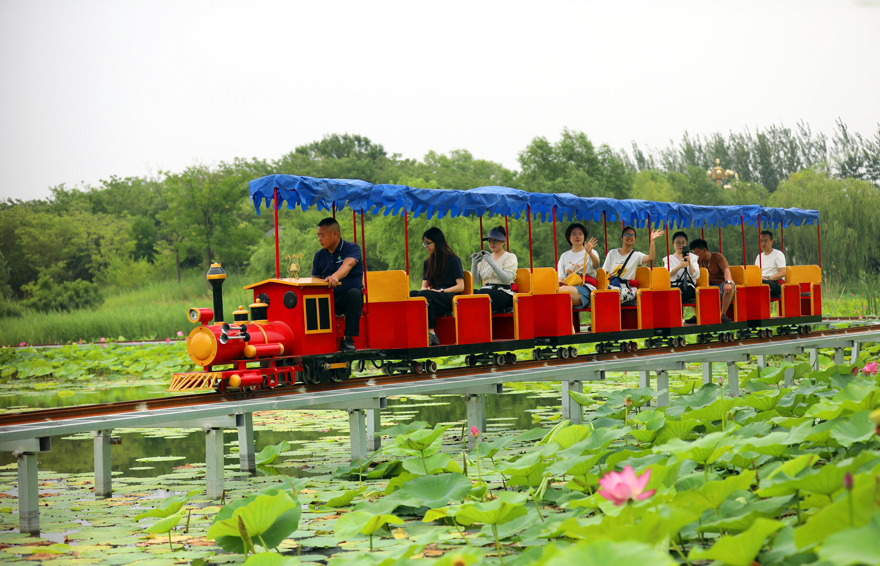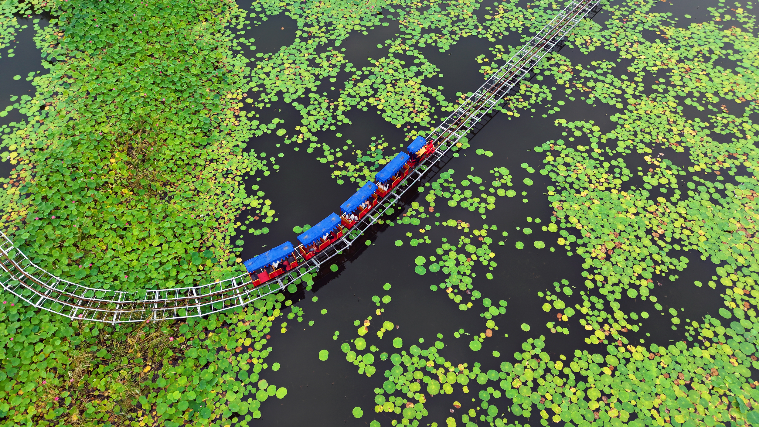 粉白相间的荷花点缀在层层叠叠的荷叶间,随风摇曳,荷香四溢。白鹭、苍鹭等水鸟低空掠过湖面,停歇在荷尖休憩,与娇艳的荷花相映成趣。复古水上小火车穿梭于荷花丛间,伴随汽笛声,游客近距离观赏盛放的荷花,与掠过车厢的飞鸟“邂逅”。造型各异的游船在湖面穿梭,游客乘坐其上随水波荡漾,感受清风拂面惬意,捕捉水鸟滑翔灵动瞬间。