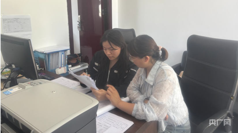 朱一然(左一)帮同事整理材料(央广网发 受访者供图)
