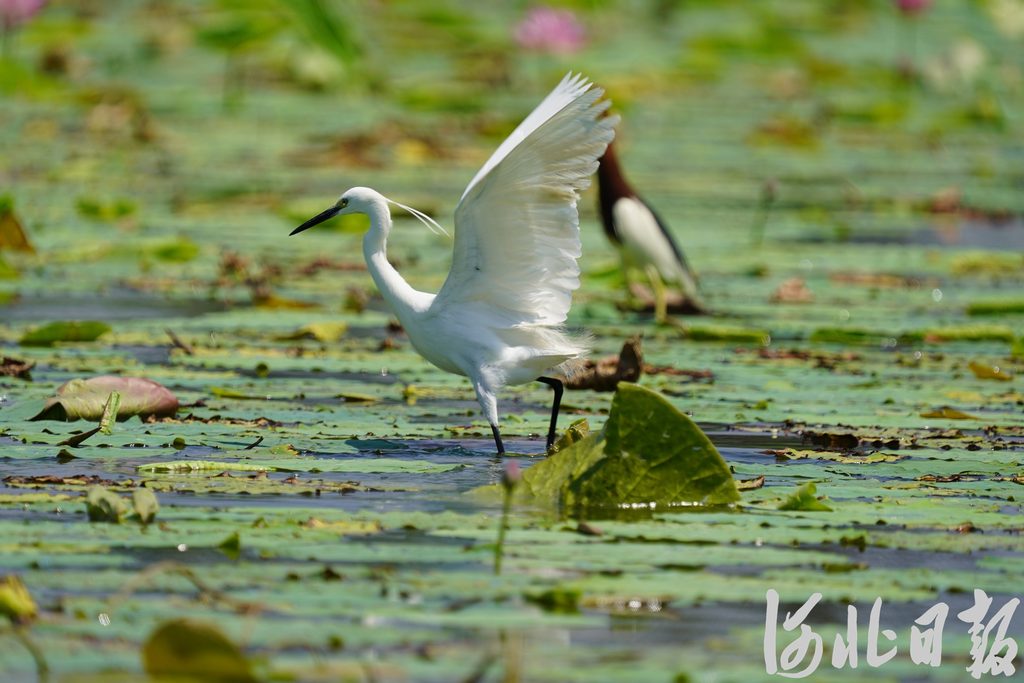 5月21日,衡水湖,一只白鹭在水中张开翅膀,尽显身姿。周津摄