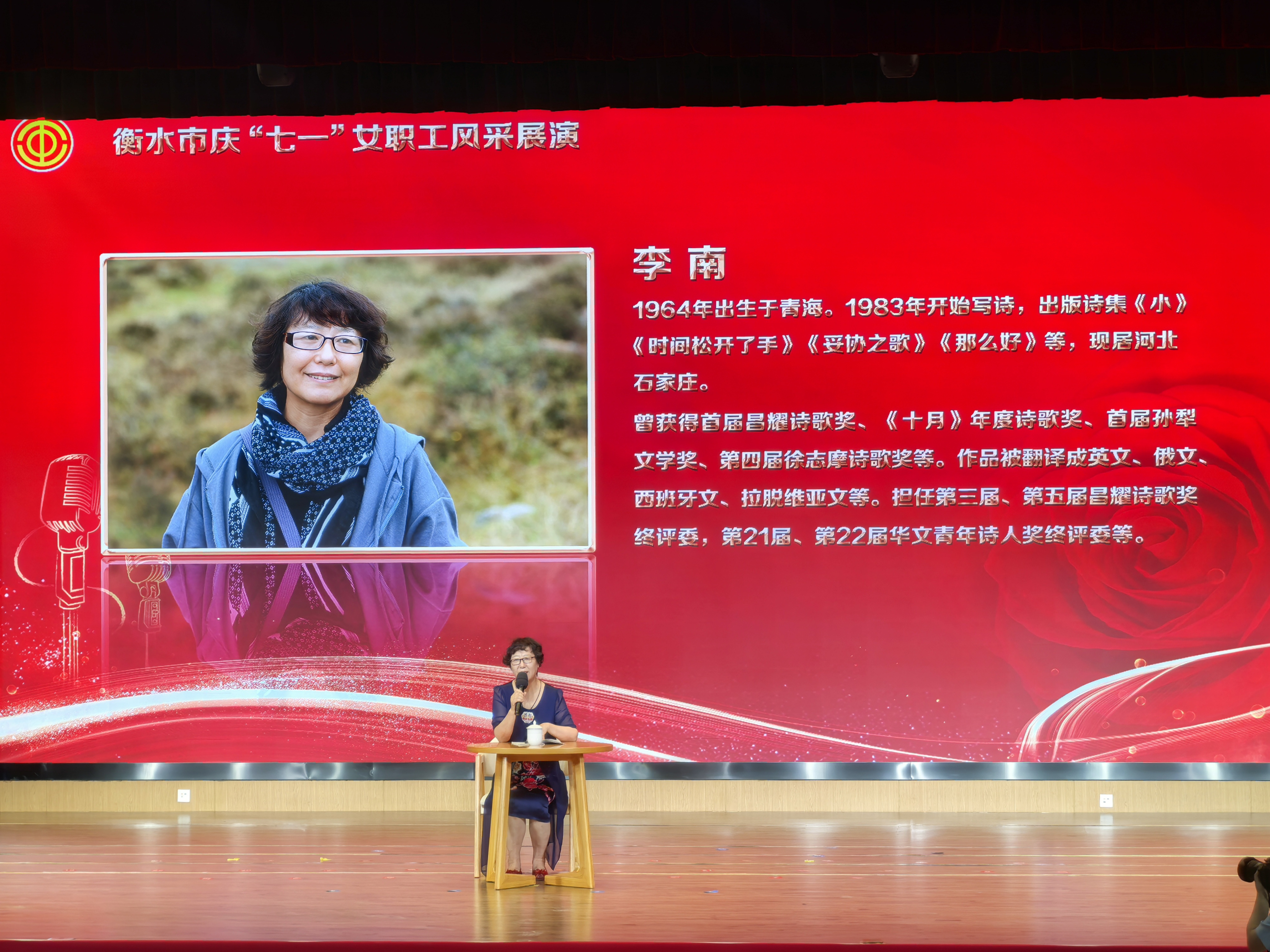 活动现场,来自我市各行各业的女职工代表纷纷上台,大家围绕主题进行展演。有的带领大家重温百余年来党的发展史,歌颂党的伟大成就;有的满怀真情,表达对党的热爱和对伟大祖国的美好祝愿;有的立足岗位实际工作,站在服务群众的第一线,诠释了中国梦的深刻内涵;有的充分展示了新时代妇女昂扬向上的精神风貌……现场高潮迭起,气氛热烈,大家以朴实的语言、丰富的素材、鲜活的事例、饱满的情感和激情地演讲,赢得了阵阵掌声。经评审,由国网衡水供电公司选送的《淑德之师》获得一等奖,阜城县总工会选送的《铭初心,记使命》、武强县总工会选送的《月光下的中国》获得二等奖,桃城区总工会选送的《青春万岁》、深州市总工会选送的《党徽下的师者之光》、故城县总工会选送的《坚守平凡岗位 书写大爱人生》获得三等奖。活动还邀请了中国当代女诗人李南分享自己对于诗歌创作的想法和感悟。