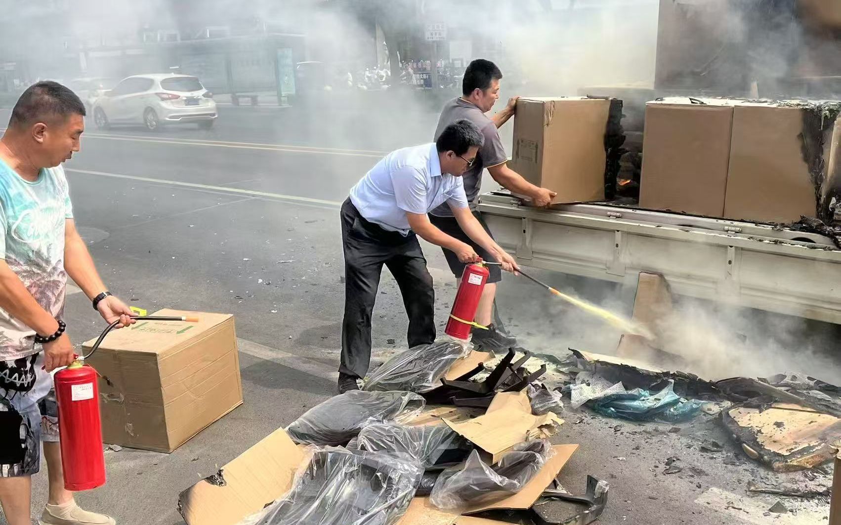 6月13日14点50分,市区和平路、康宁街路口,一名男士驾驶的货车在等红灯时突发险情——车上装载的纸箱货物突然冒烟起火。浓烟瞬间升腾而起,火势借助风势迅速蔓延,情况万分危急。