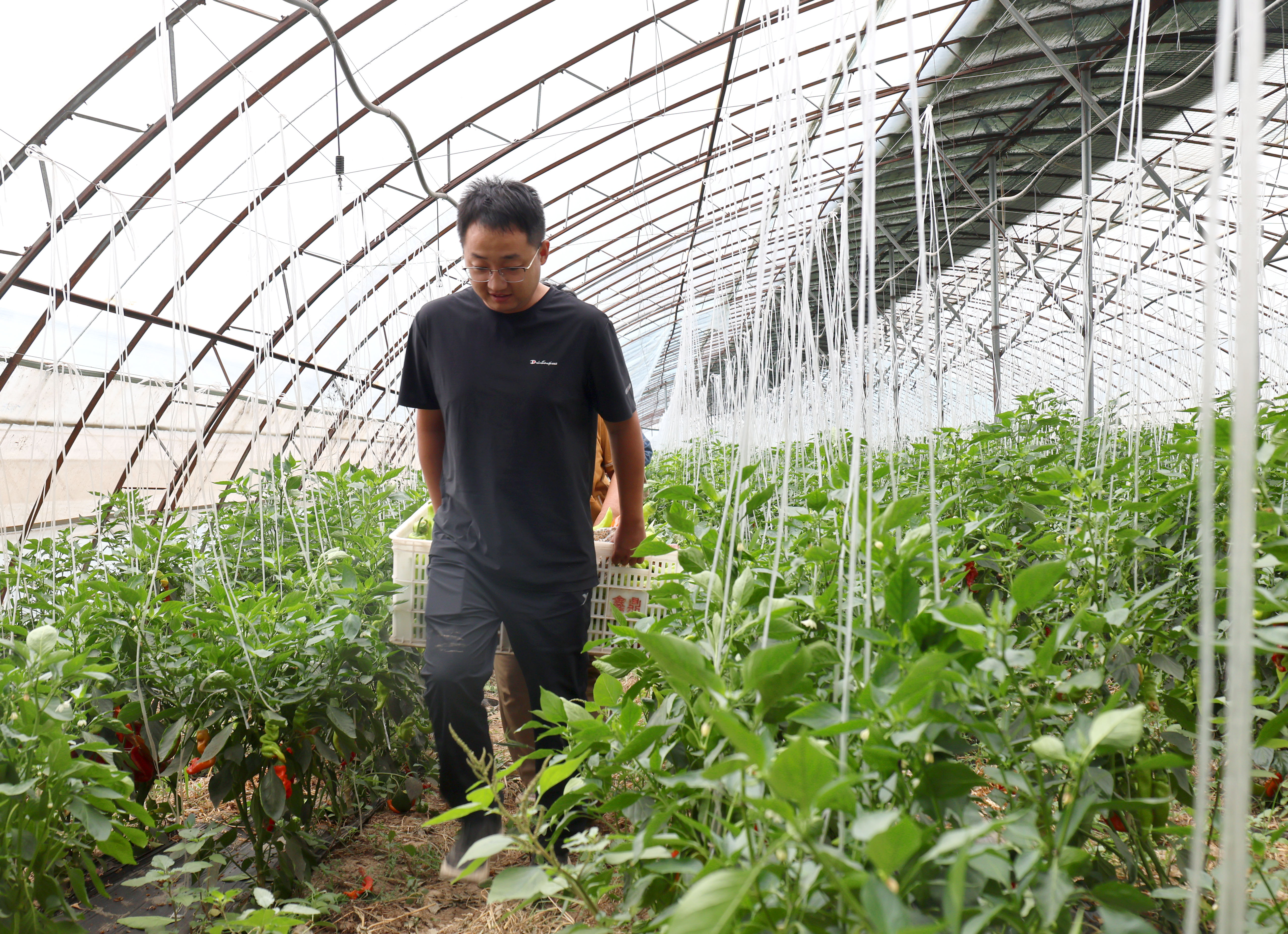 盛夏午后,衡水武邑县武罗农产品种植专业合作社的辣椒棚里,闷热如蒸笼。总经理武月鹏弓着腰穿梭在齐腰高的植株间,深色的T恤被汗水浸得深一块浅一块,只见他熟练地摘下辣椒,装满箱后,又利落地和工人一起抬起沉重的辣椒箱。这个指尖沾着泥土、额头流着汗珠的年轻人,正是村民们口中从城市回归田野的“新农人”武月鹏。
