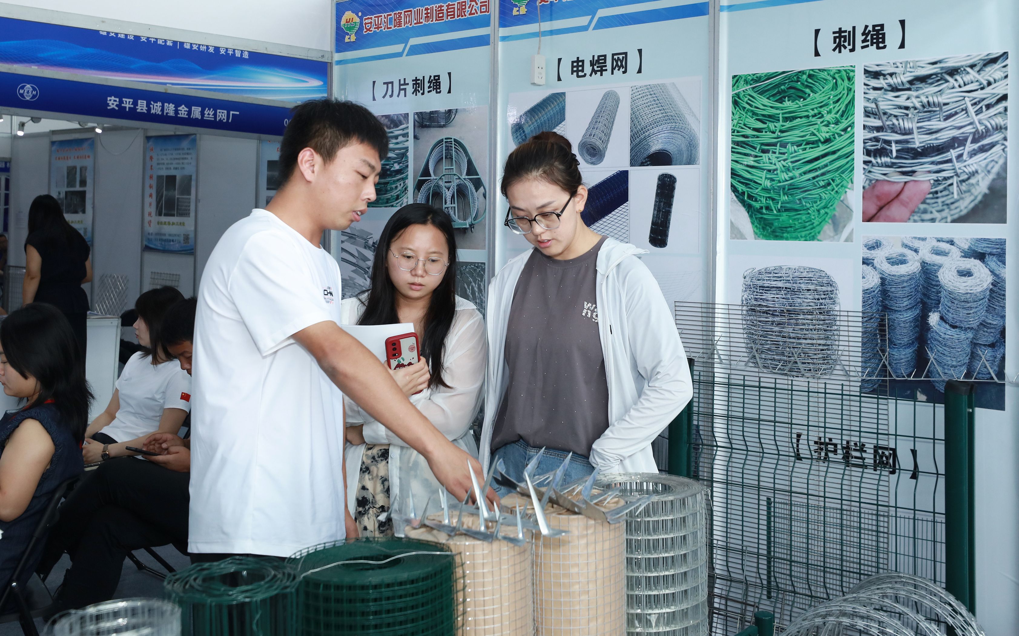 7月10日,2025雄安·衡水协作区安平丝网及农产品产贸对接会开幕式现场,参展商正在为客商介绍丝网产品。陈月振 摄