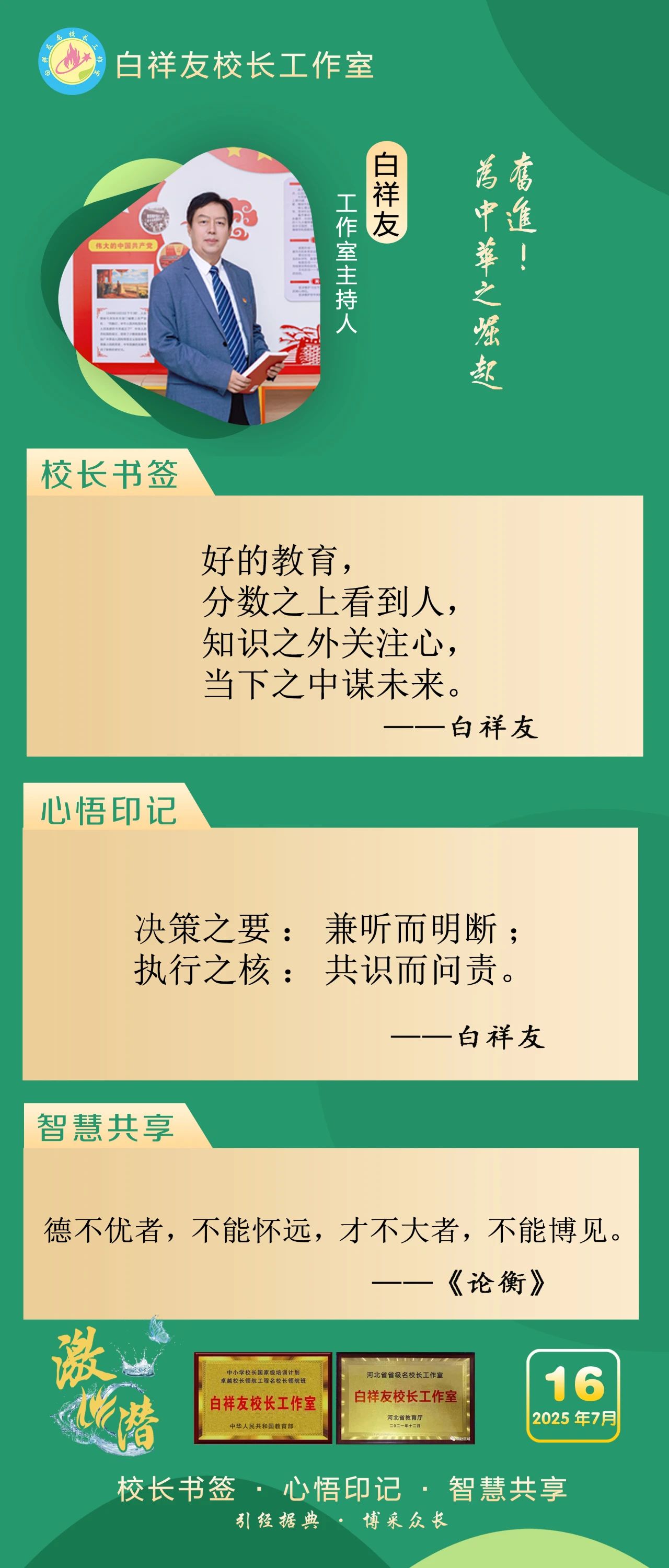 “白祥友校长工作室”成立于2019年4月,是教育部“国培计划”中小学名校长领航工程、河北省首批名校长工作室,目前省内外成员校59所。工作室坚持“资源共享、智慧共融、互助共赢”理念,已成为思想碰撞的交流场,资源共享的品牌站,成果展示的辐射源。