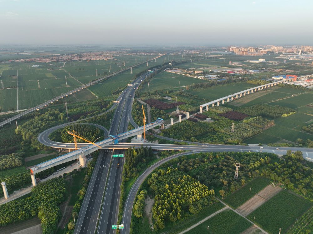 ↑ 7月18日拍摄的雄忻高铁保定东特大桥跨京港澳高速连续梁中跨施工现场(无人机照片)。