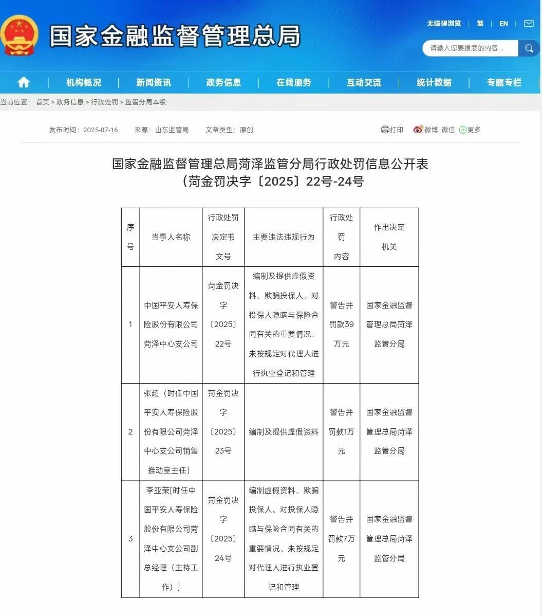 7月16日,中国平安人寿保险股份有限公司菏泽中心支公司因“编制及提供虚假资料、欺骗投保人、对投保人隐瞒与保险合同有关的重要情况、未按规定对代理人进行执业登记和管理”被山东菏泽监管分局“警告并罚款39万元”。同时,张超(时任中国平安人寿保险股份有限公司菏泽中心支公司销售推动室主任)被警告并罚款1万元;李亚荣[时任中国平安人寿保险股份有限公司菏泽中心支公司副总经理(主持工作)被警告并罚款7万元。