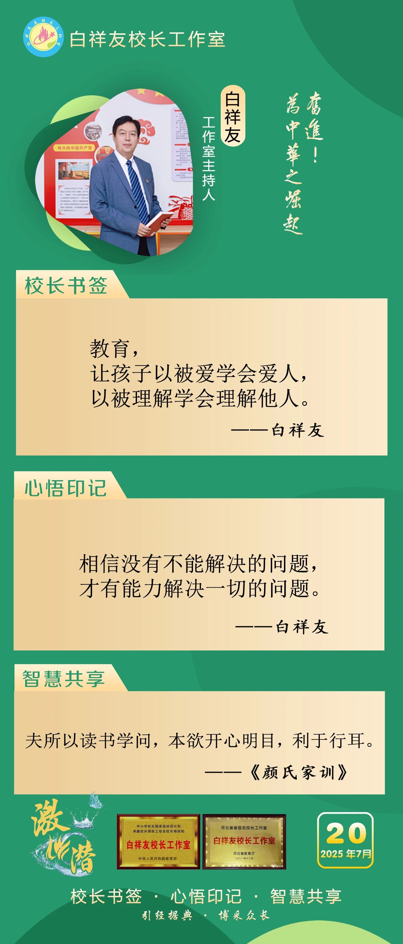 “白祥友校长工作室”成立于2019年4月,是教育部“国培计划”中小学名校长领航工程、河北省首批名校长工作室,目前省内外成员校59所。工作室坚持“资源共享、智慧共融、互助共赢”理念,已成为思想碰撞的交流场,资源共享的品牌站,成果展示的辐射源。