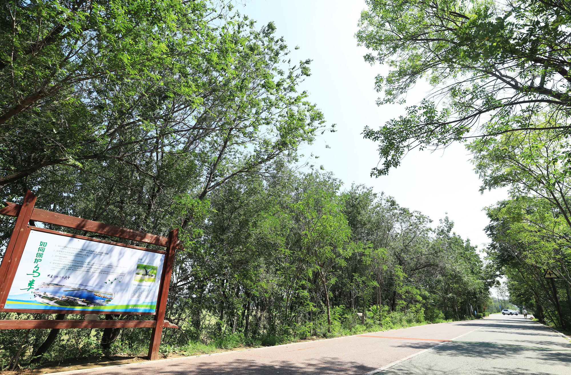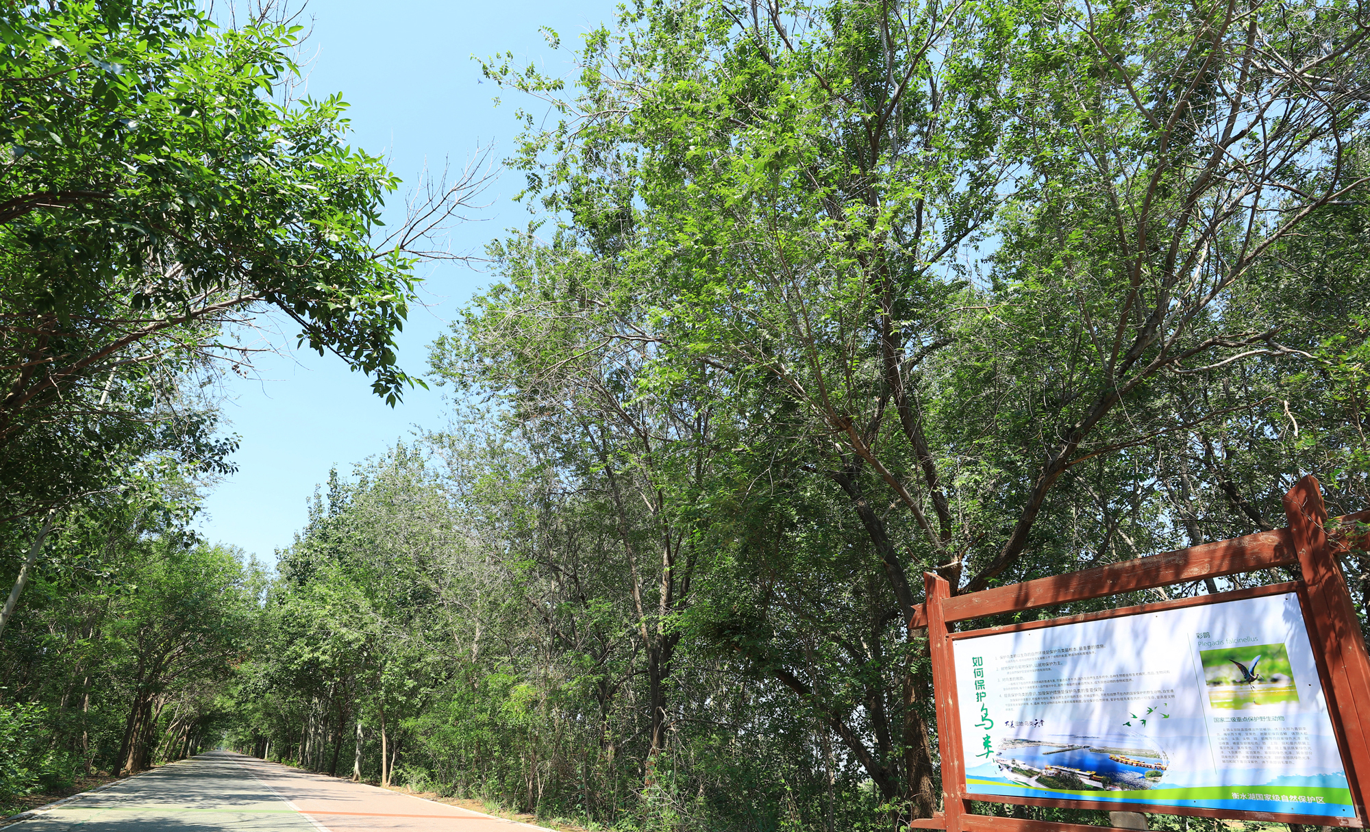 七公里的衡水湖健步路,藏在浓荫深处。道旁乔木舒展枝叶,灌木缀满新绿,阳光穿过层层叠叠的叶隙,在路面洒下斑驳的光点。风过时,树叶沙沙作响,裹挟着草木与湖水的清润气息,漫过整条长径。