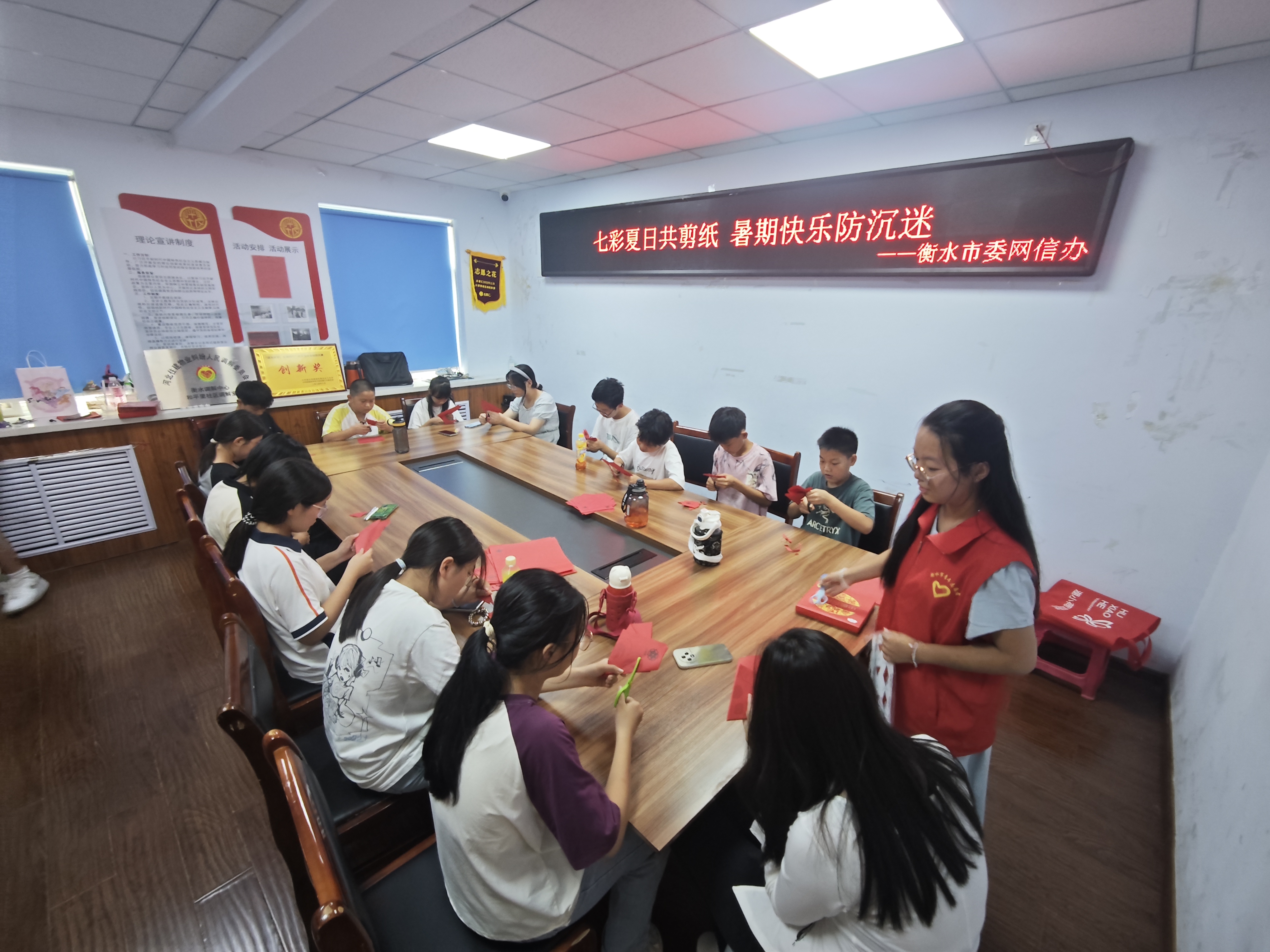 为有效预防未成年人沉迷网络,引导青少年在多元文化体验中健康成长,7月23日下午,衡水市委网信办在桃城区和平里社区开展“七彩夏日共剪纸 暑期快乐防沉迷”预防未成年人沉迷网络宣传活动,通过非遗剪纸项目让孩子们放下手机,近距离感受传统文化魅力。