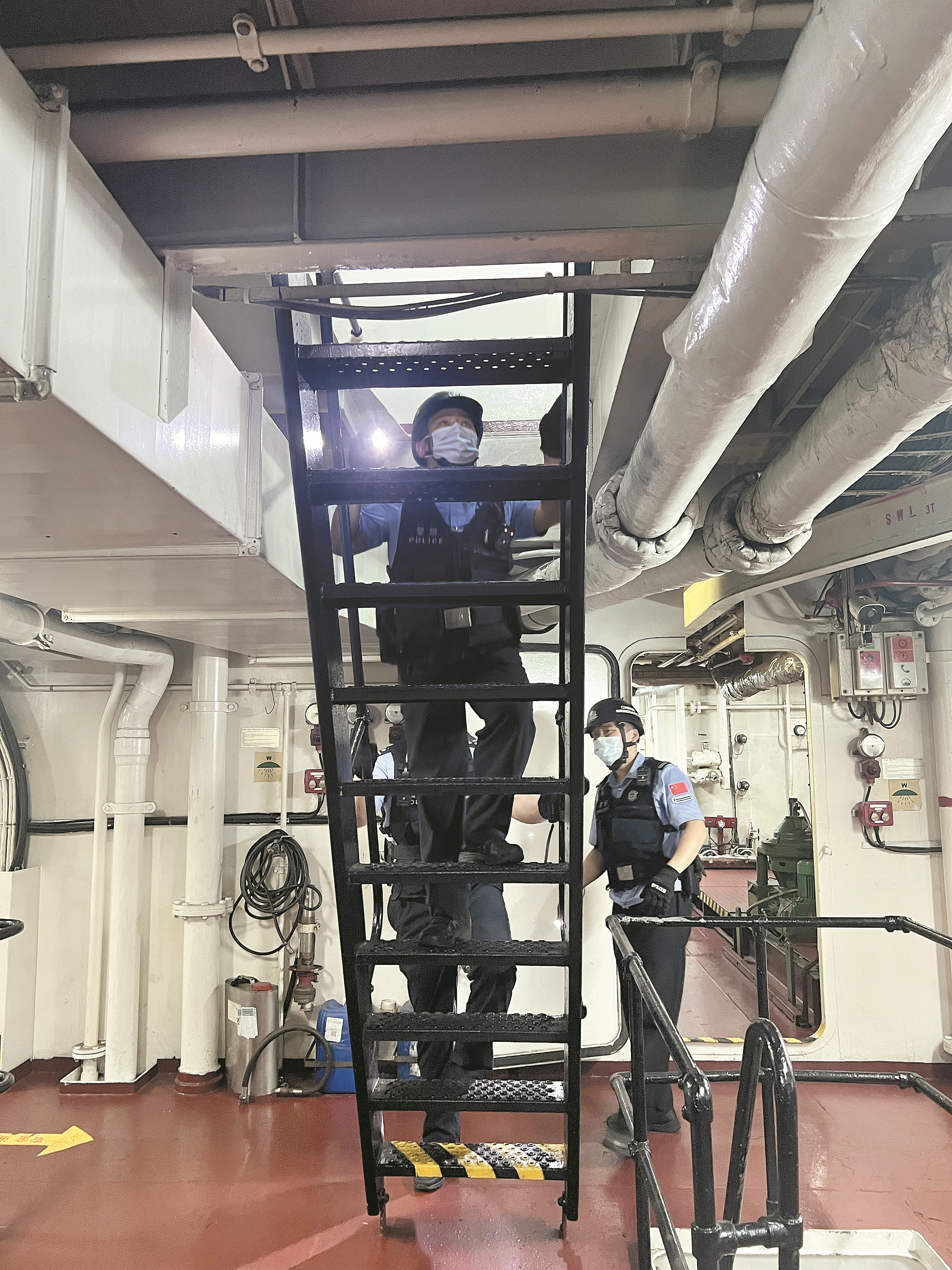 秦皇岛出入境边防检查站民警乘坐吊篮进行船体检查。