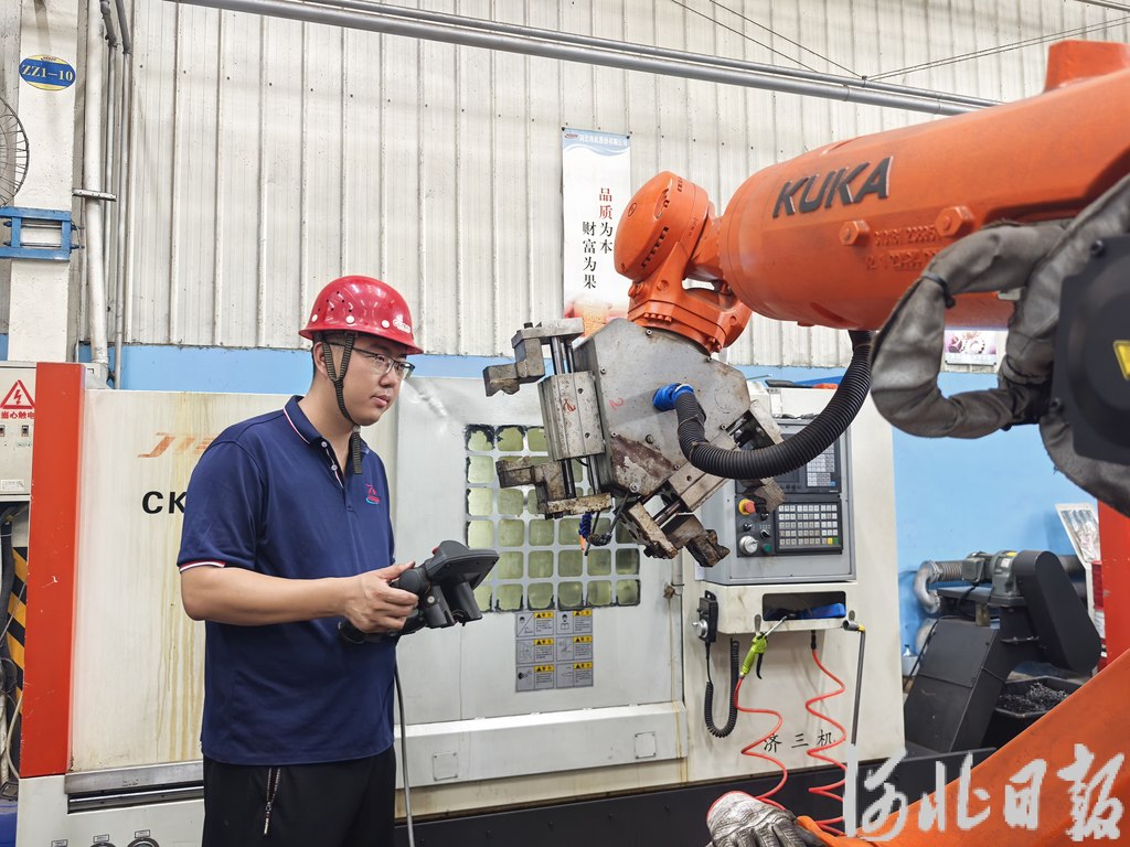 7月27日,在河北电机股份有限公司生产车间,首席技师印超正在对机器人设备进行调试。 河北日报记者 解楚楚摄