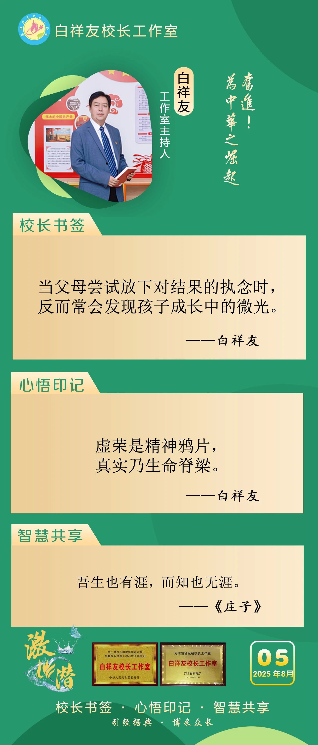 “白祥友校长工作室”成立于2019年4月,是教育部“国培计划”中小学名校长领航工程、河北省首批名校长工作室,目前省内外成员校59所。工作室坚持“资源共享、智慧共融、互助共赢”理念,已成为思想碰撞的交流场,资源共享的品牌站,成果展示的辐射源。
