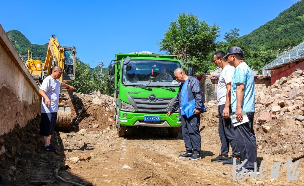 8月6日,在兴隆县六道河镇五道河村,驻村工作组正在查看清淤清障施工进度。河北日报记者李佳泽摄
