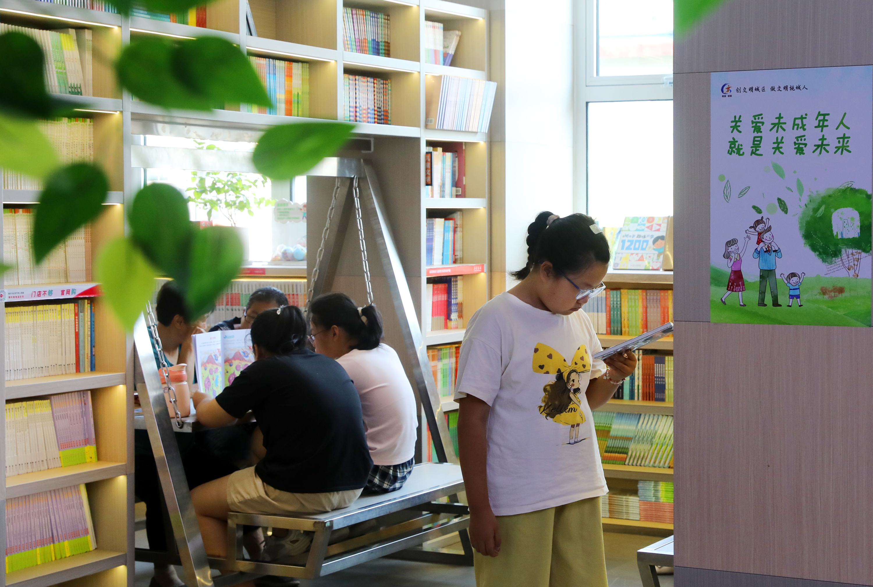 书架前,孩子们或踮脚搜寻,或驻足翻阅,认真挑选心仪书籍;座位区中,不少孩子安静端坐,手捧读物潜心阅读,沉浸于书中故事。“这里凉快又安静,还能提升我写作业的速度。”即将升入六年级的学生刘婧一边翻阅课外读物,一边对记者说。