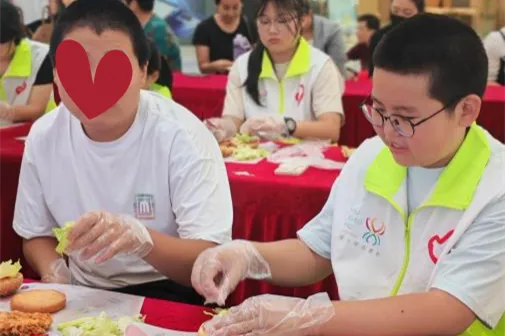 活动期间,团市委联合市同心青少年志愿服务中心在万达广场组织开展“小橘灯”残健融合——手工DIY汉堡活动。“湖小荷”志愿者们与特殊儿童结对分组,折翼天使们在志愿者的引导和帮助下摆放面包、夹生菜、涂抹酱料、放肉饼。志愿者们通过温暖的话语和真诚的互动,为帮扶对象传递鼓励与支持。