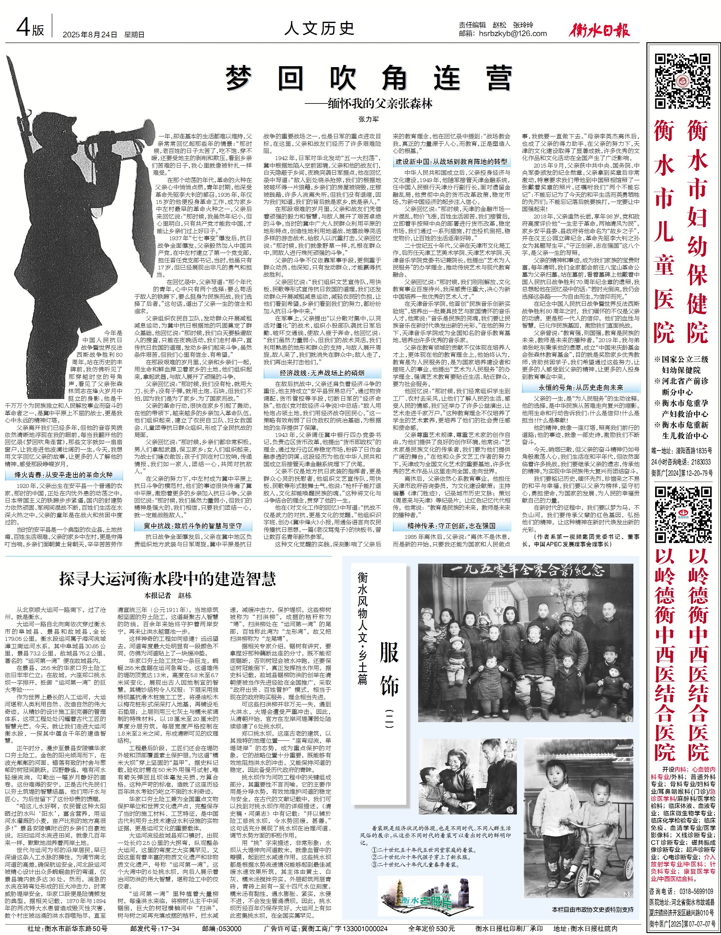 今年是中国人民抗日战争暨世界反法西斯战争胜利80周年。站在历史的丰碑前,我仿佛听见了那穿越时空的号角声,看见了父亲张森林同志在烽火岁月中挺立的身影。他是千千万万个为民族独立和人民解放事业而奋斗的革命者之一,是冀中平原上不屈的战士,更是我心中永远的精神灯塔。