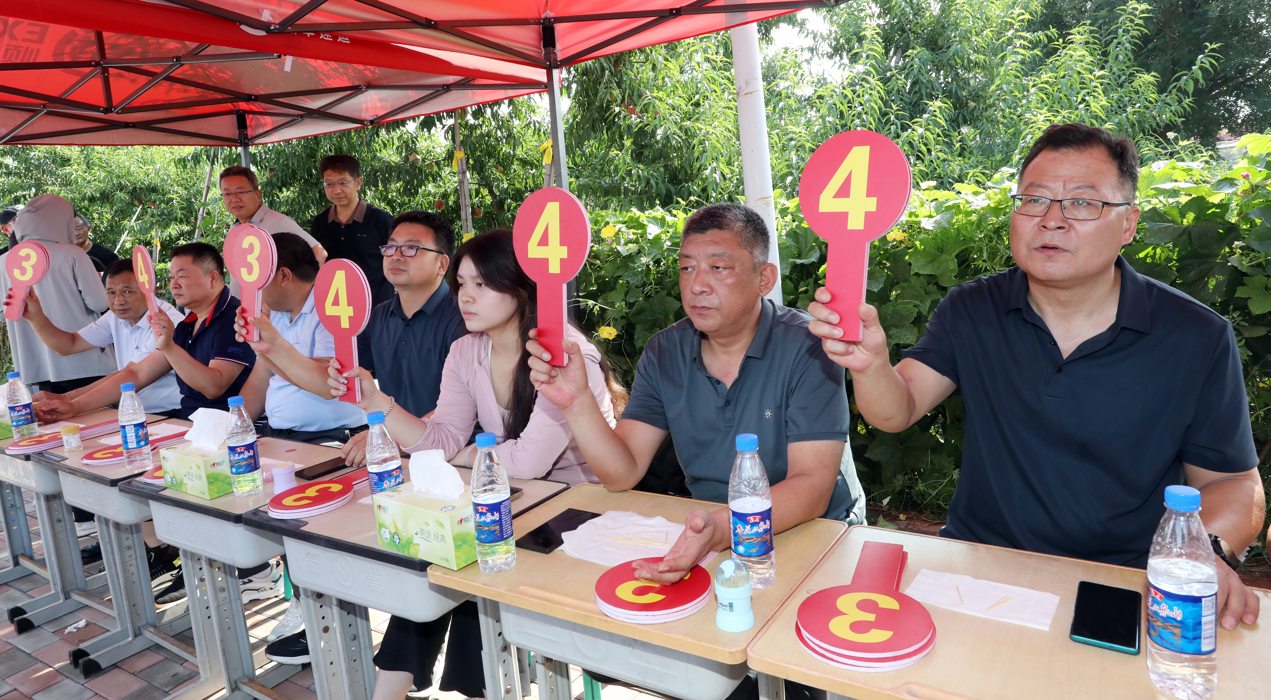 本届“桃王争霸赛”是深州市打造“人面桃花 爱在深州”城市品牌开展的蜜桃季系列活动之一。比赛现场,由深州市农业农村局、市场监管局等相关部门组成评审团,按照果型色泽、口感风味、含糖量等指标对参赛蜜桃进行综合评定。所有蜜桃重量均在350克以上,并全部以编号匿名参评,确保公平公正。