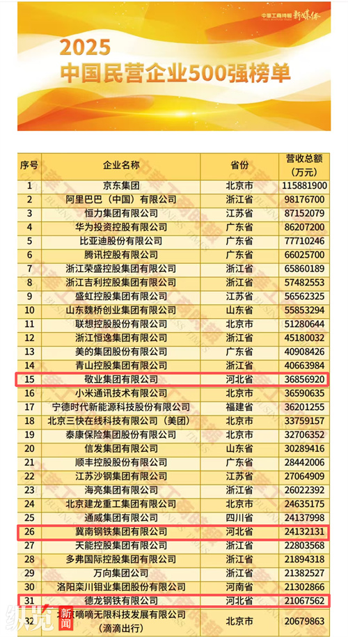 来源:纵览新闻客户端原标题:纵览原创|“2025中国民营企业500强”榜单公布,河北32家企业上榜,10家营收总额超千亿