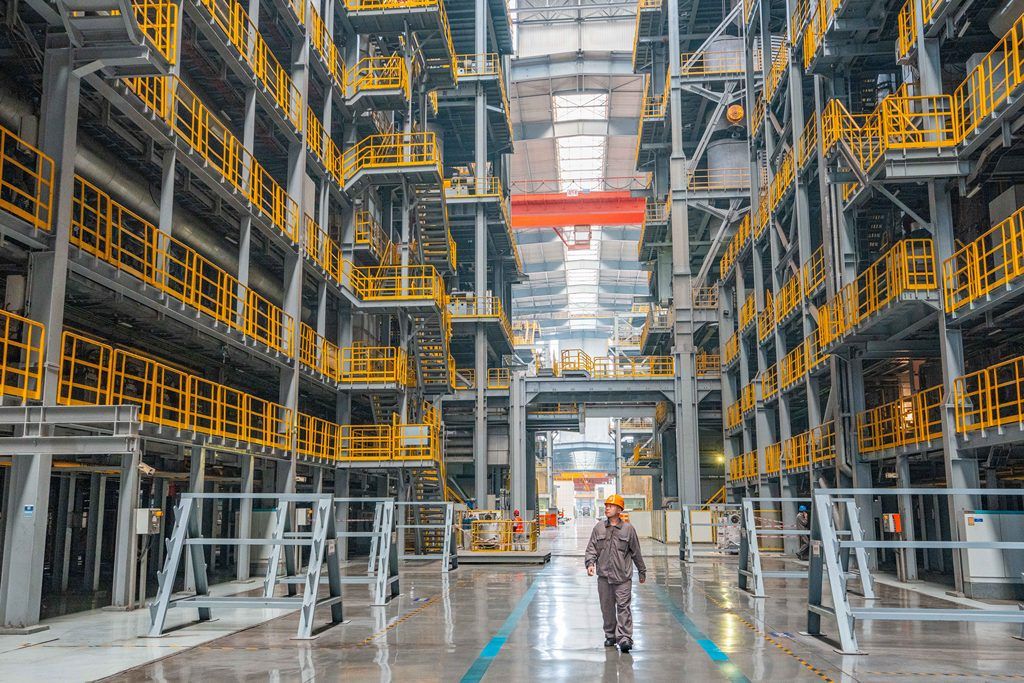 在首钢智新电磁材料(迁安)股份有限公司,机器人在生产线上作业。