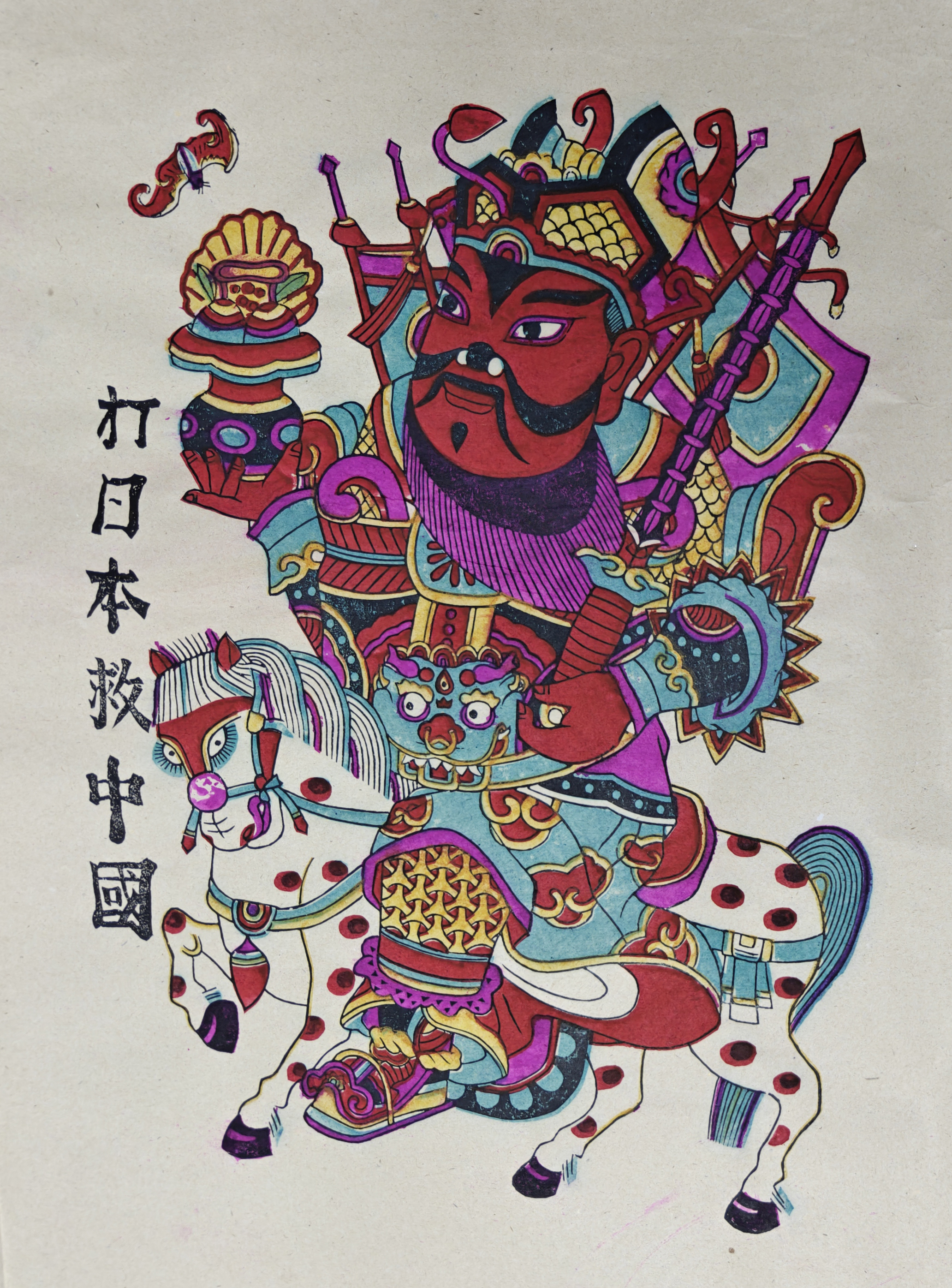 在武强年画博物馆的革命年画展区,一幅幅创作于抗日战争时期的年画作品静静陈列。不同于普通年画驱凶辟邪、祈福纳祥的主题,这些作品在创作上将保家卫国的情怀融入其中,形成了新的年画品类——抗战年画。展示区里,一幅《打日本救中国》门神年画引人注目。这幅年画以传统骑马门神形象为基础,旁边印着“打日本救中国”六字标语,画上的门神怒目圆睁、手持兵器,威武而有震慑力。尽管时代变迁,如今站在这幅年画前,依然可以让人一眼望去血脉偾张。