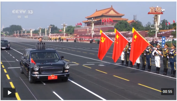 伟大旗帜光耀千秋。中国共产党党旗、中华人民共和国国旗、中国人民解放军军旗在受阅部队最前方迎风招展。检阅车行进至党旗、国旗、军旗前,敬礼号角响起,习近平停车肃立,以注目礼向三面旗帜庄严致敬。