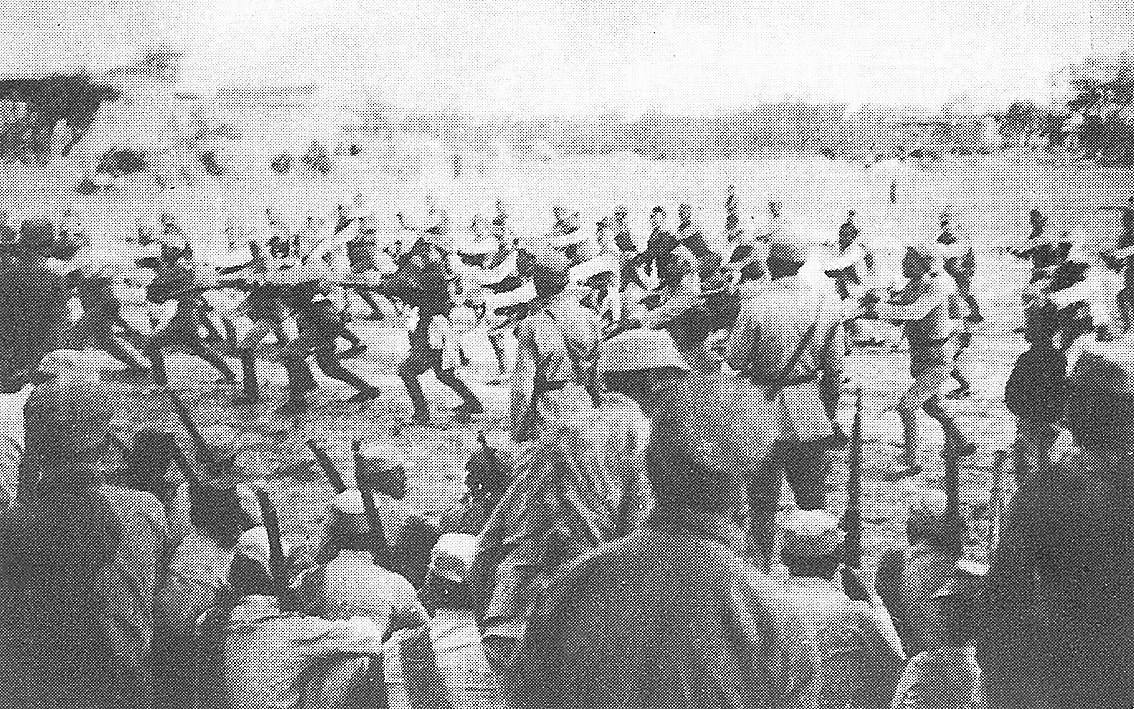 八路军一二九师东进抗日游击纵队司令员陈再道指挥部队向敌冲锋。