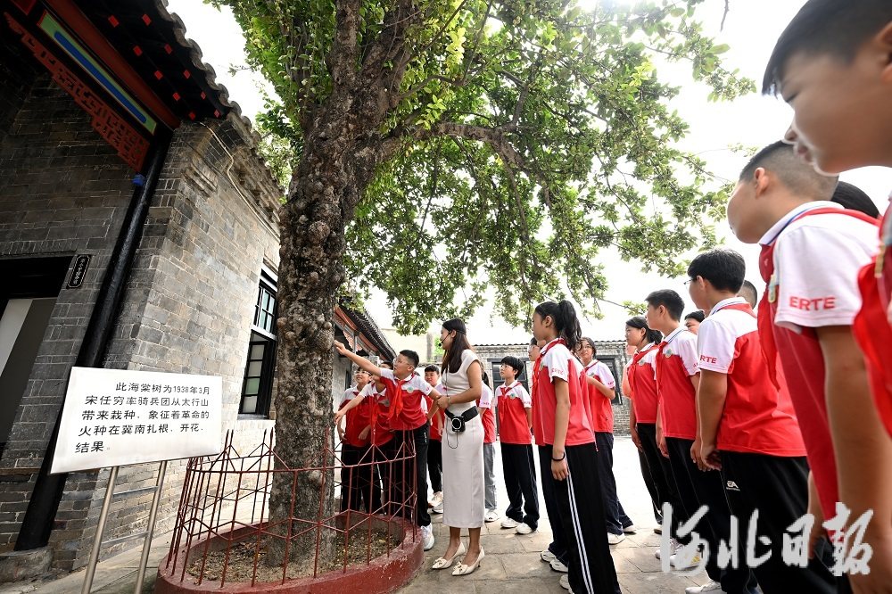8月30日,八路军一二九师东进抗日游击纵队司令部旧址,南宫市新城中心学校学生在聆听抗战故事。