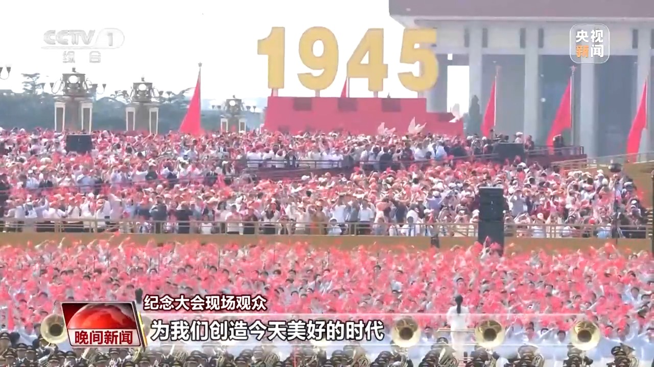 纪念大会现场观众:就像总书记说的“执大象、天下往”,我觉得我们今天真的有能力、有担当,去维护世界的繁荣与和平。同时我们也要铭记历史,珍惜过去革命先辈、抗日英雄们创造的美好时代。在新时代,我们更应该努力,踔厉奋发,创造更加美好的未来。