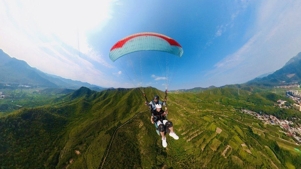 近日,在石家庄井陉县的风屿飞行航空飞行基地,游客体验滑翔伞飞行项目。风屿飞行航空飞行基地供图