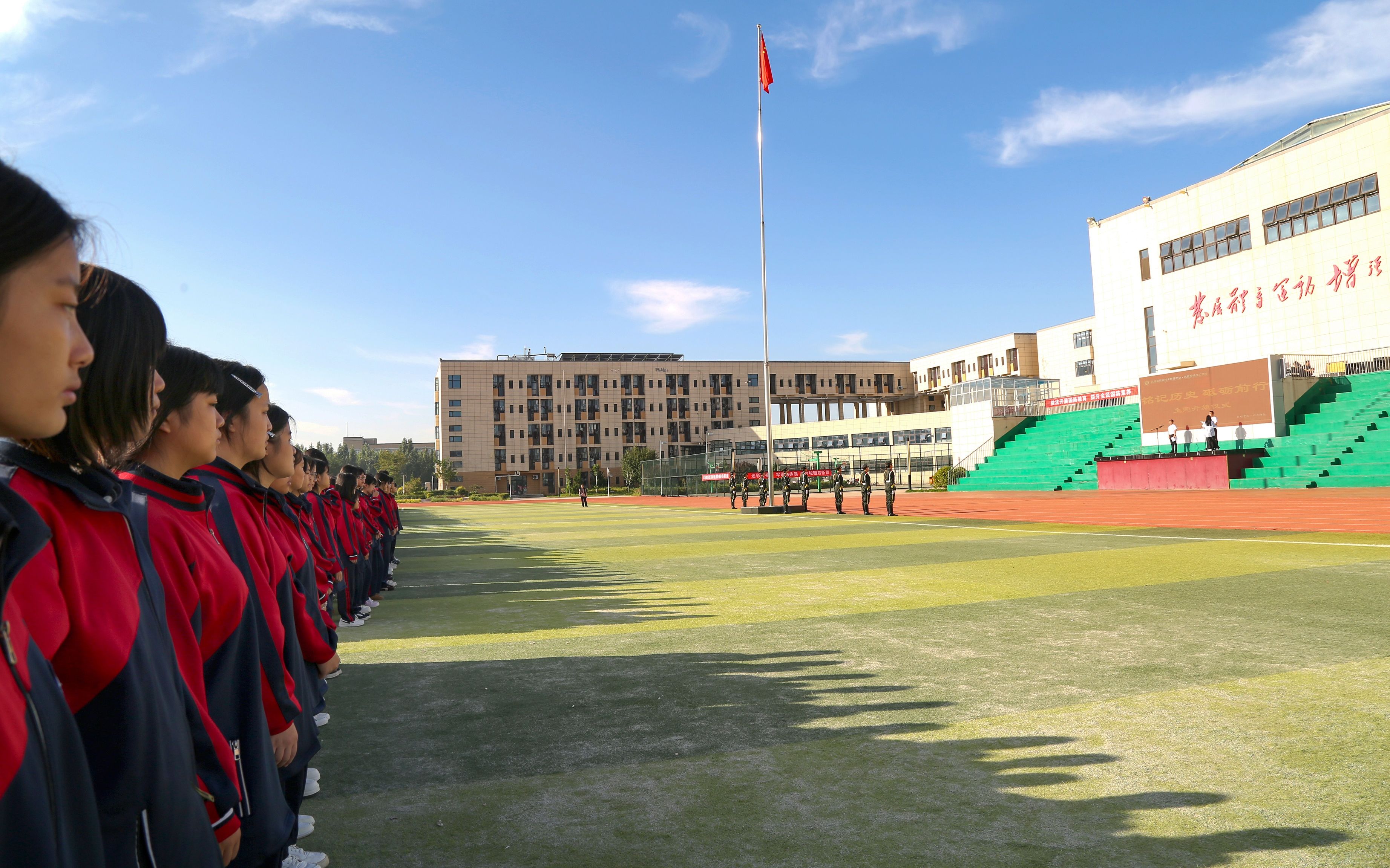 当日清晨,全体师生在运动场整齐列队,庄严肃立。伴随着雄壮激昂的国歌,五星红旗冉冉升起,在“九一八”这个刻骨铭心的日子里,整个仪式更添庄严与厚重。