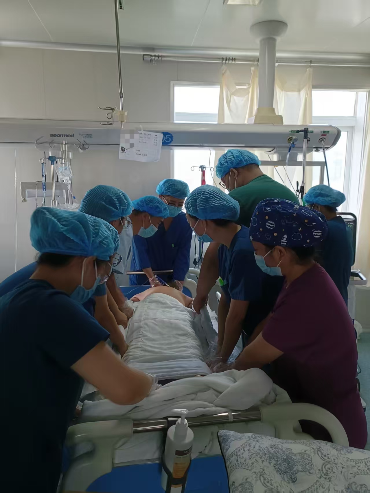 “患者意识尚存,插管难度大!”麻醉科医生赶到时,刘艳虹语气焦急。支气管镜探查结果更为棘手——患者肺内已是弥漫性出血,宛如一片“红色迷雾”。刘艳虹立即组织团队讨论,决定实施俯卧位通气治疗。随后,吸痰、插管等操作紧锣密鼓展开,9名医护人员协同调整患者体位,刘艳虹反复叮嘱:“头偏向一侧,保持气道通畅,注意防止皮肤压伤。”此后四天,每天下午5时至次日早晨8时,医护人员都会合力为患者翻身,昼夜轮班间,还要精准调控抗炎、激素、止血等多种药物。