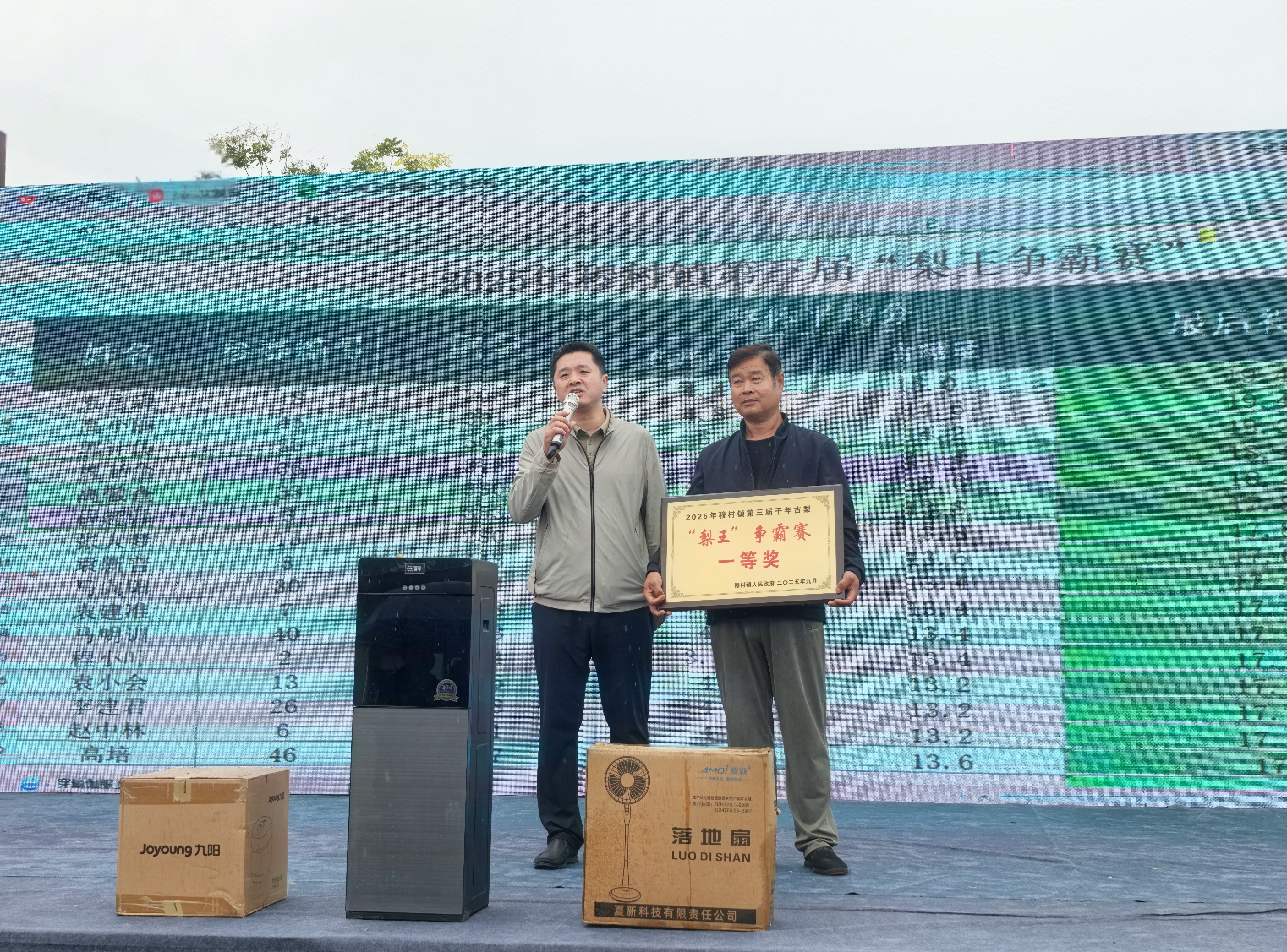 比赛现场气氛热烈,评委们严格按照果实重量、含糖量、口感和果型果面等多维度标准进行综合评分,力求现场评定出最货真价实的“梨王”。每一个参评的古梨都承载着果农们的辛勤与期望,经过一番紧张而激烈的角逐,最终梨农袁彦理选送的古梨凭借出色的表现,以总分19.4分的高分脱颖而出,荣获本次争霸赛的“梨王”称号,现场响起了热烈的掌声和欢呼声。