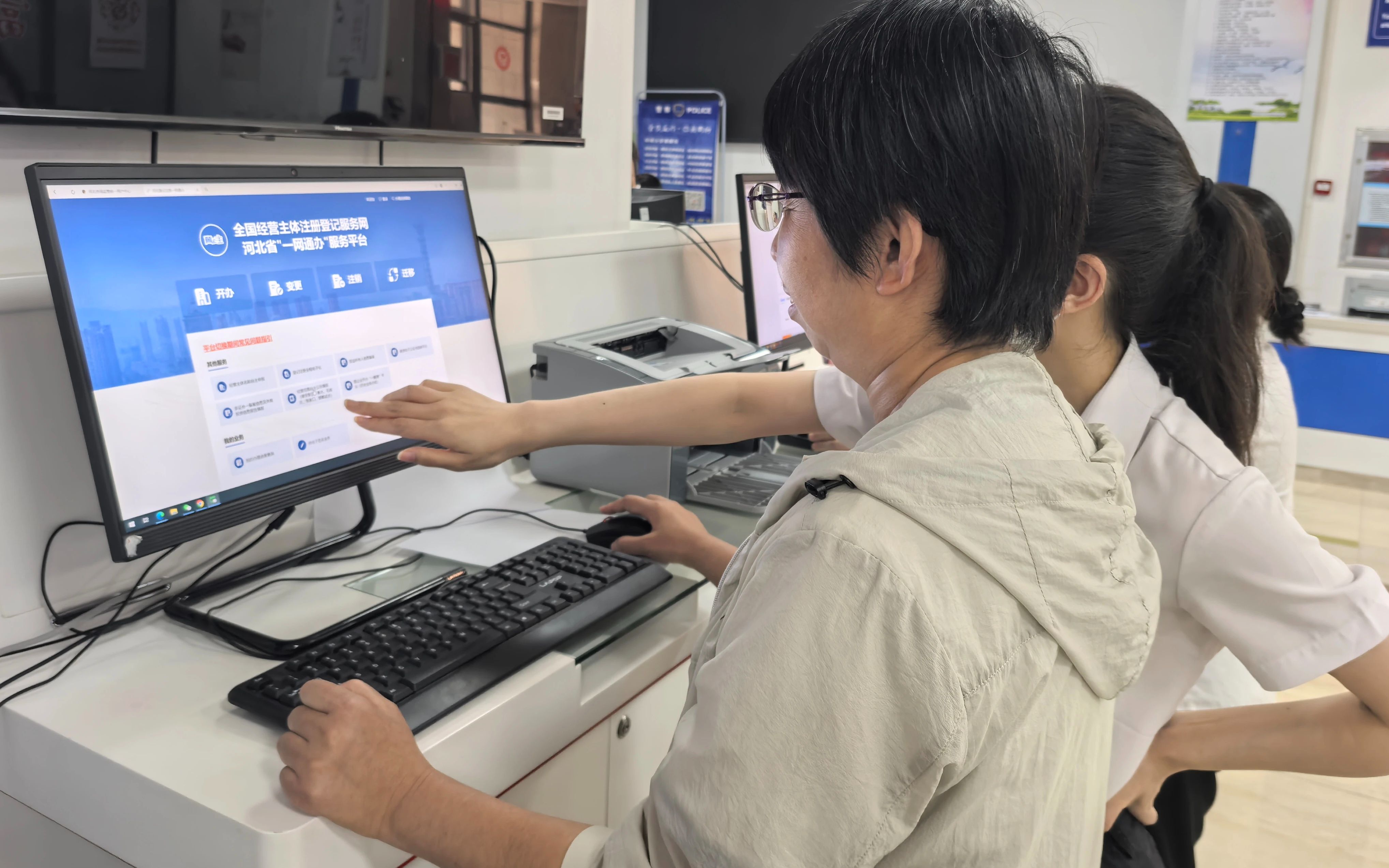 工作人员正在指导办事群众通过网上服务平台办理业务