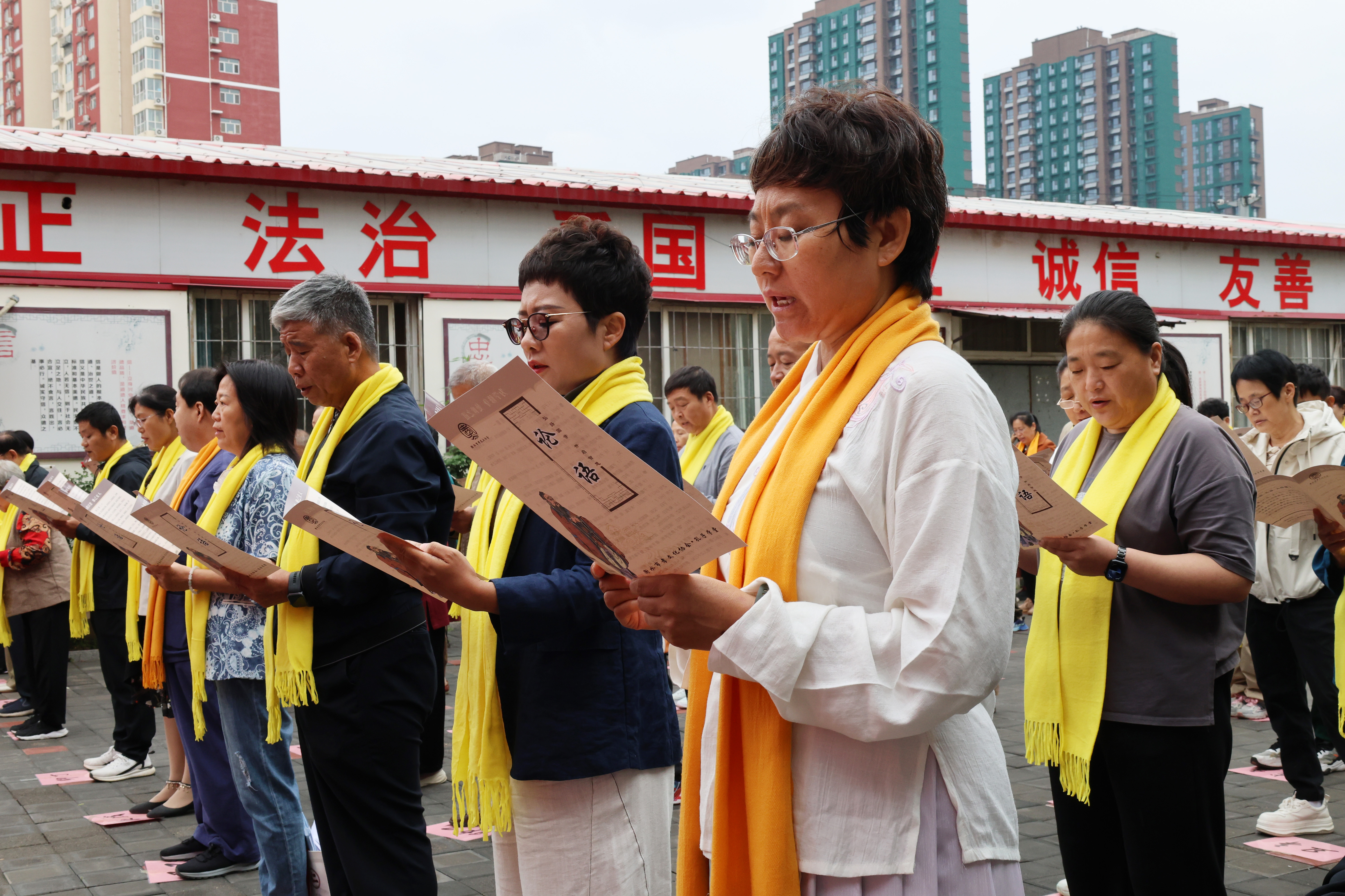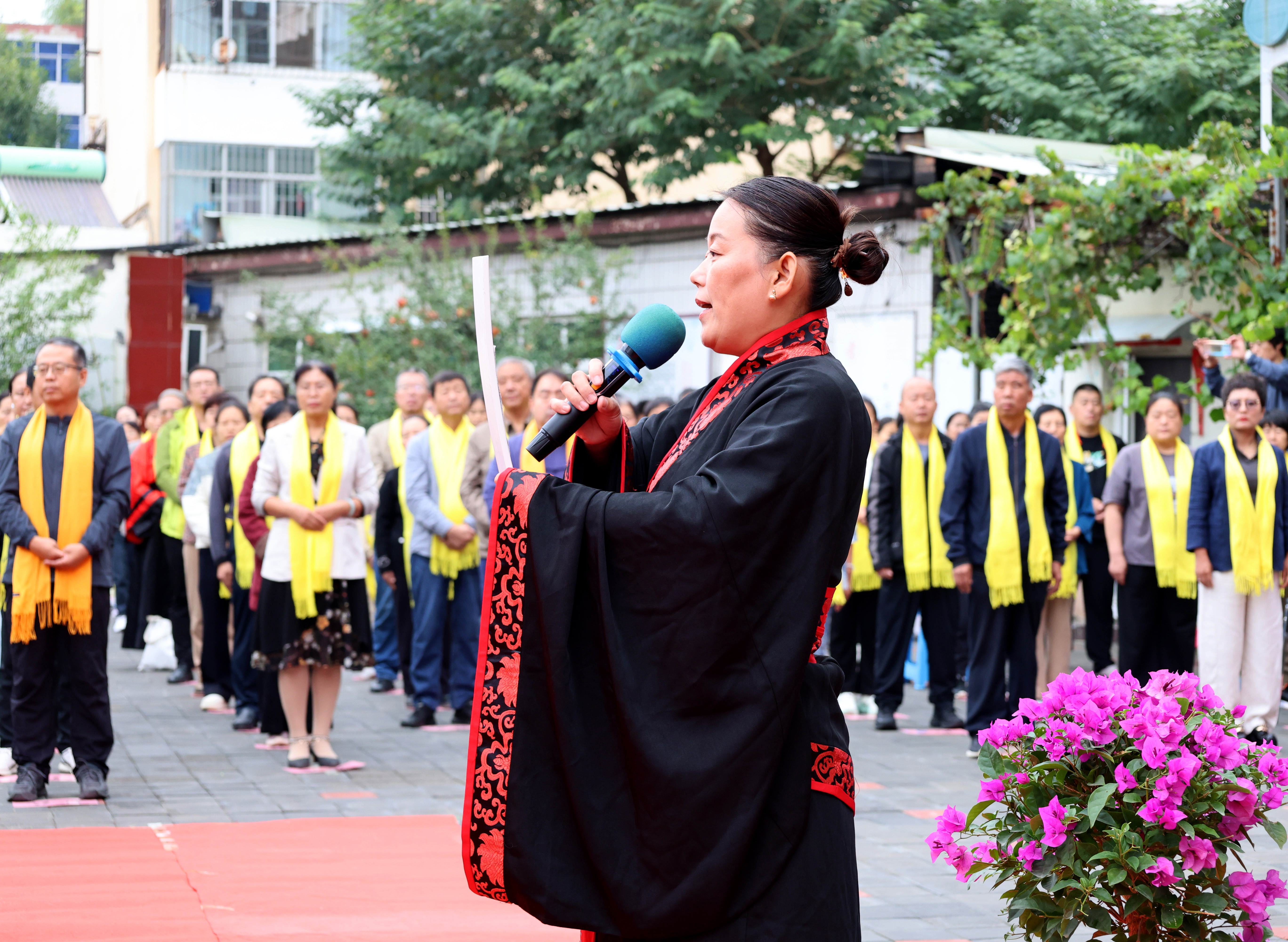 活动现场,来自衡水市各社会团体、国学学堂、文化机构的百余名国学爱好者齐聚一堂。大家统一佩戴黄色绶带,部分参与者身着汉服,整齐站立于院内,以升国旗、读祭文、行拜礼、诵经典等传统仪式,缅怀至圣先师孔子,传承中华优秀传统文化。