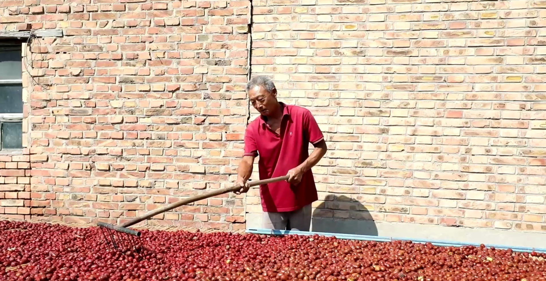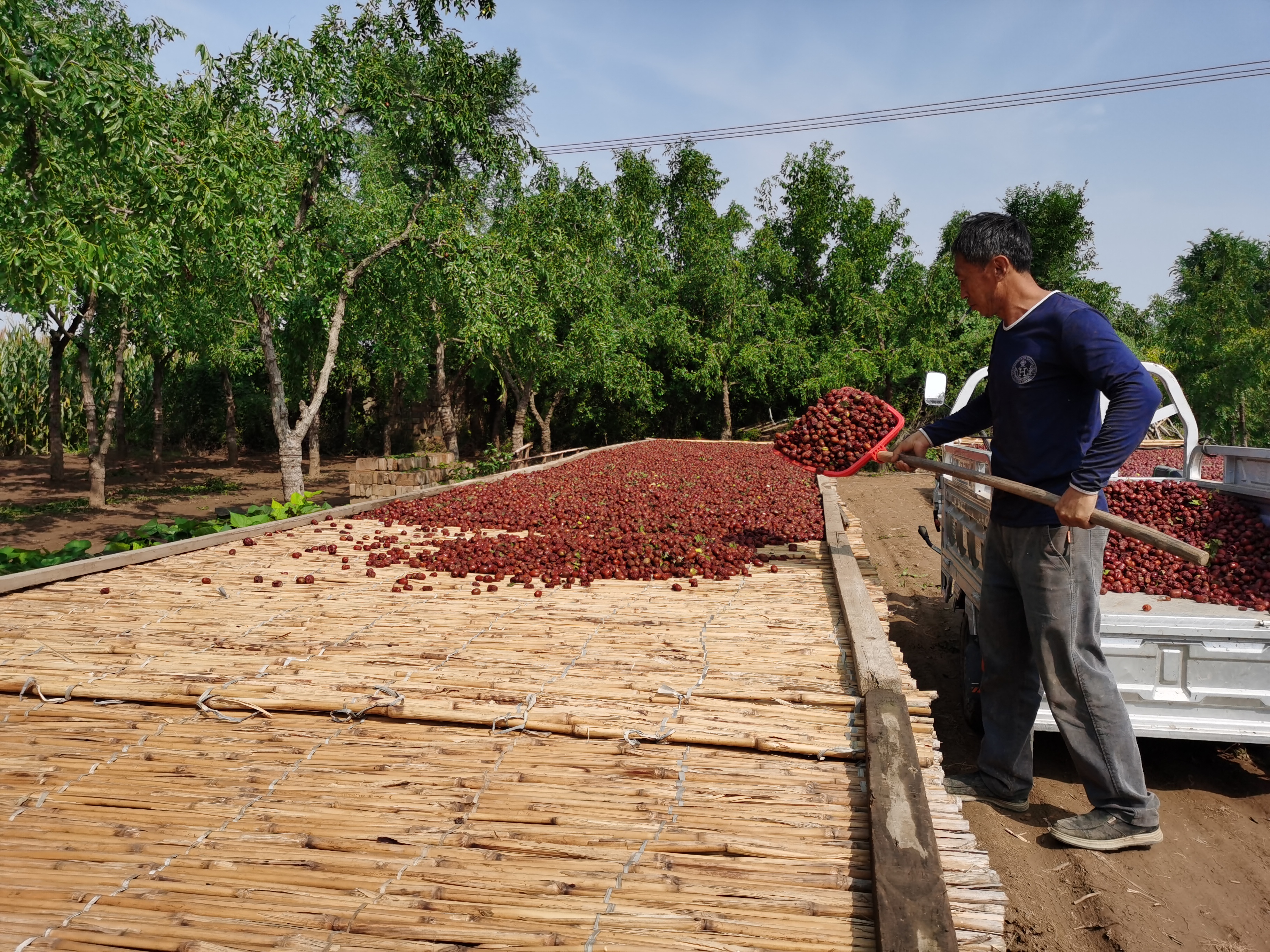 在晾晒场上,村民沈磊正把刚采下的鲜枣均匀铺在竹席上。“上午摘,下午晒,一周就能出枣干,还能多卖钱。”阳光下,一排排红艳艳的枣子铺展如毯,散发出浓郁甜香。