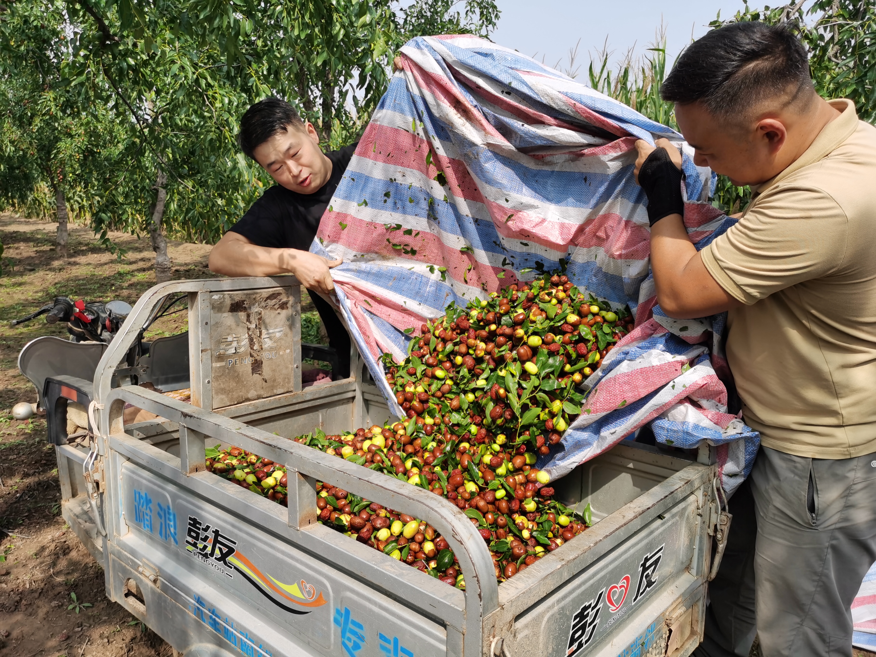 村民陈新会一边麻利地收拢帆布四角,把鲜枣倒进停在一旁的三轮车里,一边笑着递给记者一把刚摘下的枣,“尝尝,这枣特别甜!”