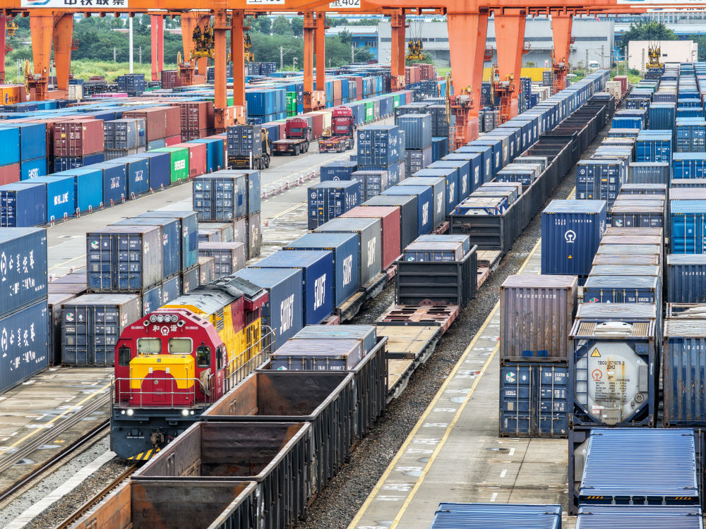 2025年9月8日,满载“重庆造”汽车的中欧班列(成渝)在重庆团结村中心站等待发车(无人机照片)。新华社记者 唐奕 摄