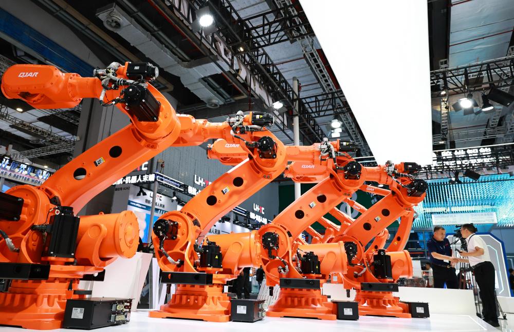 这是2025年9月23日在上海举行的第25届中国国际工业博览会上拍摄的一组大型工业机器人产品。新华社记者 方喆 摄