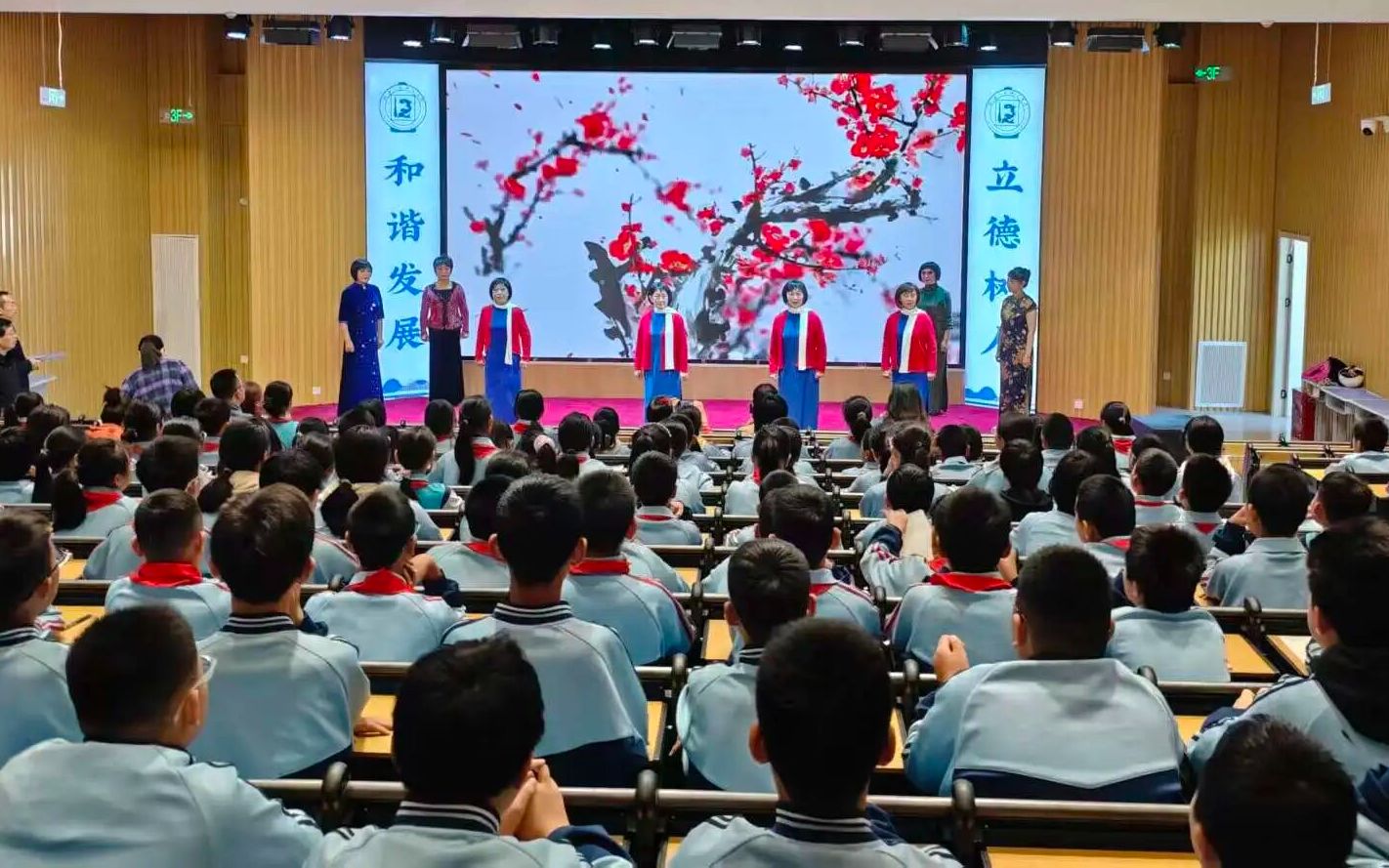 活动现场,经典剧目轮番上演,每一段表演都让孩子们沉浸其中。红色经典《红心向党》以激昂的旋律点燃了全场师生的爱国热情;《洪湖赤卫队》选段再现了革命岁月的艰辛与坚定,令人动容;《红灯记》中“诉说革命家史”的片段,表演细腻传神,将红色基因融入戏曲叙事;家喻户晓的《智斗》登场时,熟悉的旋律与演员们精彩的“飙戏”瞬间将现场气氛推向高潮,掌声与喝彩声不绝于耳。精美的戏服、专业的唱念做打,让原本存在于课本中的传统艺术变得真切可感,师生们全神贯注,深深沉浸在传统戏曲的独特魅力之中。