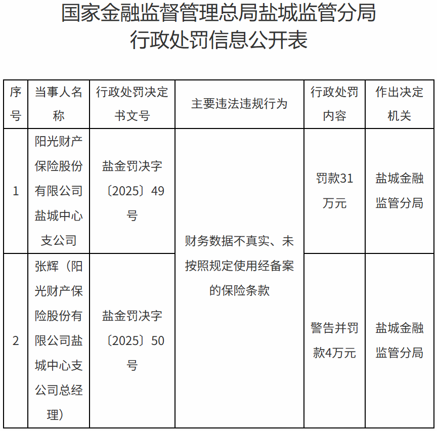 近日,国家金融监督管理总局盐城监管分局罚单显示,阳光财产保险股份有限公司(下简称“阳光财险”)盐城中心支公司因财务数据不真实、未按照规定使用经备案的保险条款等,遭罚款31万元;对总经理张辉警告并处罚款4万元。