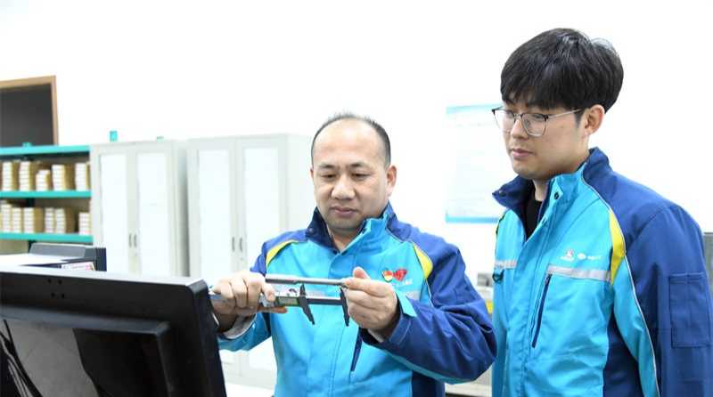 4月22日,在中国二十二冶集团有限公司中冶重工(唐山)有限公司力学实验室,总工程师李景生(左)正带领技术人员进行材料拉伸性能分析。(河北日报)