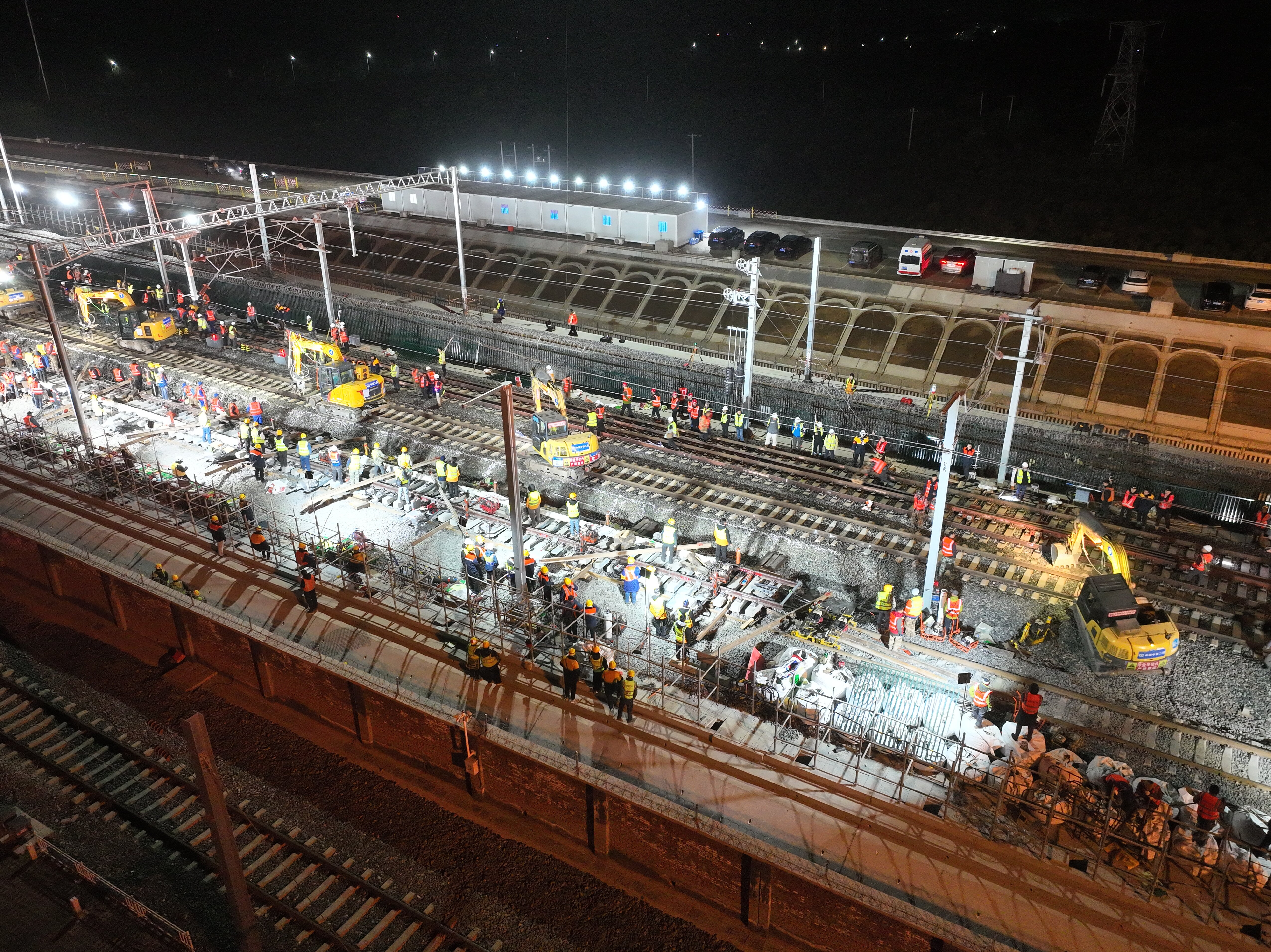 铁路大型施工离不开高效协同。衡水工务段充分发挥配合单位的桥梁纽带作用,主动联动施工、监理等单位,构建“施工—监理—配合”协同作战保障体系。各单位紧密配合、细化分工,确保各专业、各环节衔接顺畅。施工中同步推进信号设备调试与道岔联锁试验,精准对接列车运行节点,实现施工与行车安全两不误,保障了800余人参与的多专业交叉作业高效有序推进,圆满完成了分两次、各历时540分钟的昼夜连续攻坚任务。