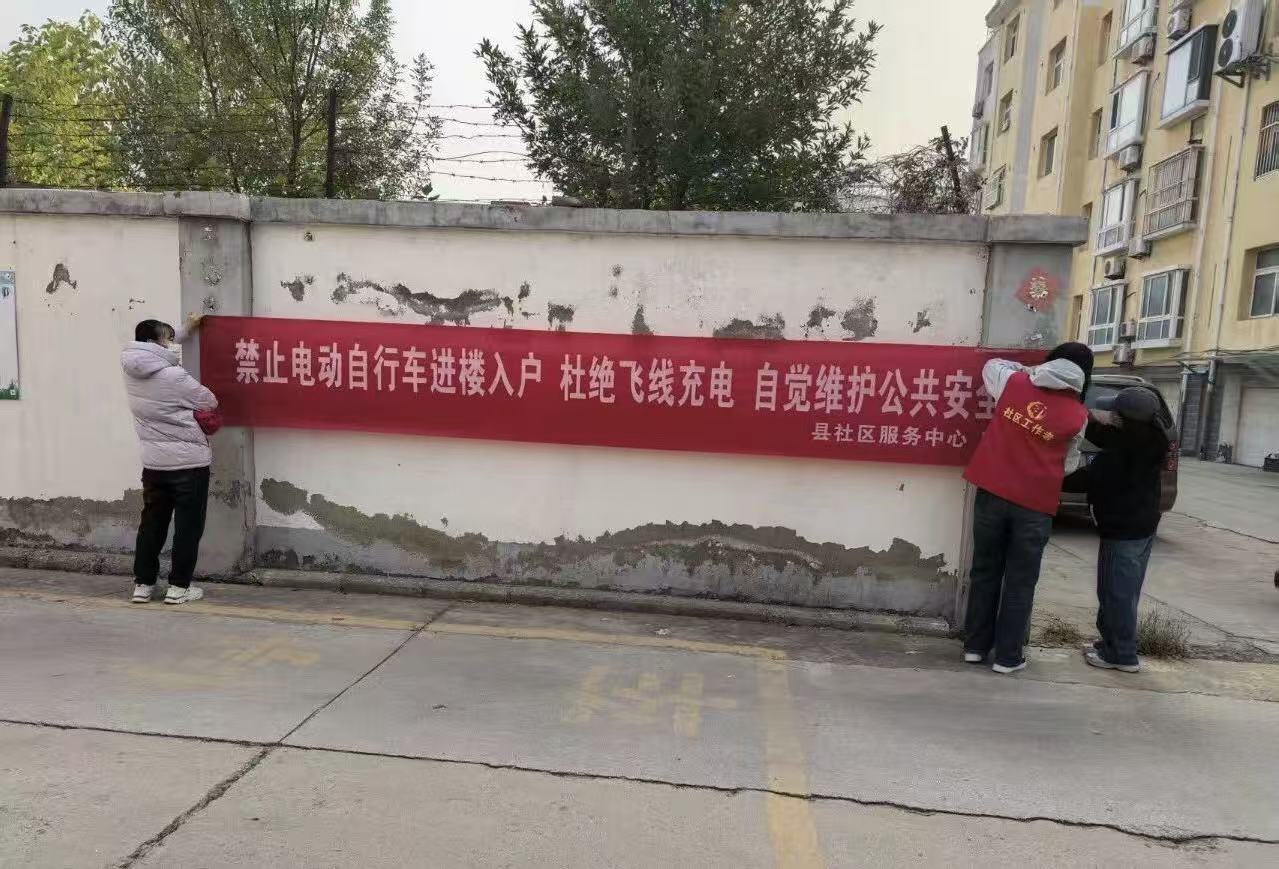 活动开始,社区工作人员带着提前准备好的消防安全宣传条幅,走进辖区内的各个小区。从小区入口的显眼位置,到居民楼楼下的公告栏旁,再到小区内的休闲广场周边,工作人员分工协作,有条不紊地将一幅幅主题鲜明的消防宣传条幅悬挂起来。