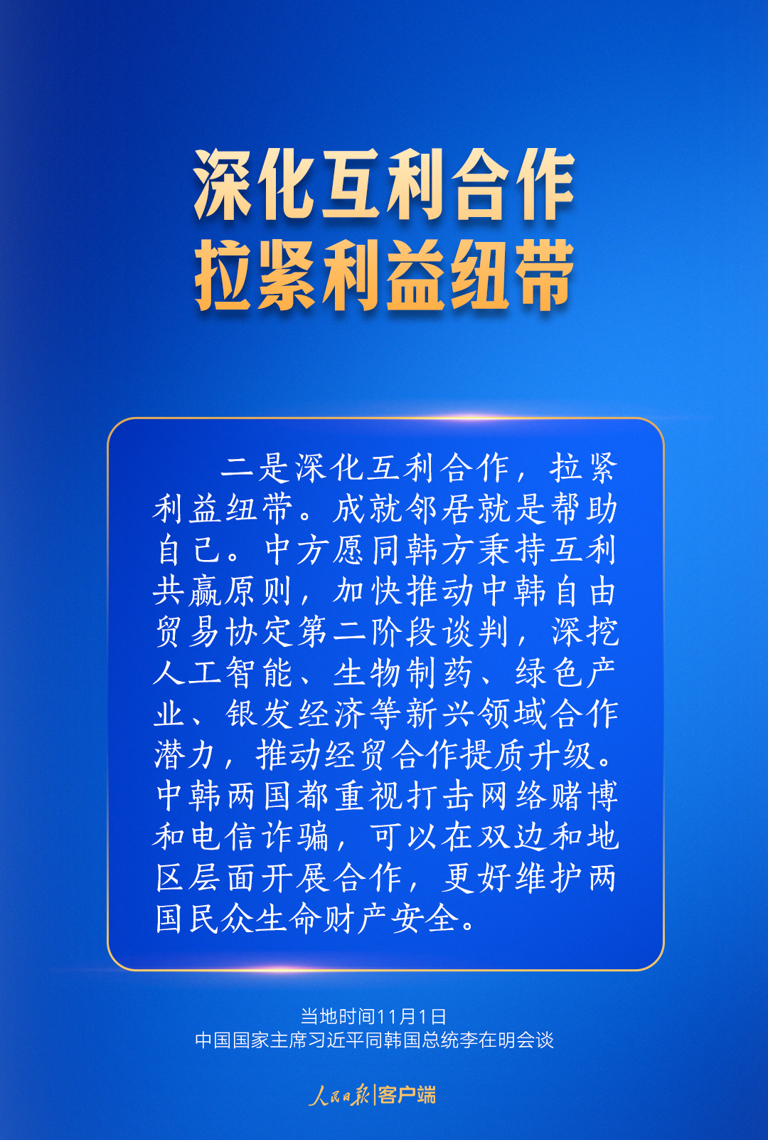 编辑:贾扬阳 来源:人民日报客户端 原标题:开辟中韩关系新局面,习近平提出4点建议 点赞 +1 微博 微信 我要评论 发布 相关推荐 为中非共逐现代化之梦提供新机遇——习近平主席向第39届非洲联盟峰会致贺电引发热烈反响 要闻 6小时前 拾光纪·以马为喻,习近平这样勉励你我他 时政 8小时前 《求是》杂志发表习近平总书记重要文章《当前经济工作的重点任务》 要闻 10小时前 习近平总书记关切事|老字号闯新路 要闻 17小时前 独家视频丨习近平向全国各族人民 向港澳台同胞和海外侨胞拜年 要闻 1天前 独家视频丨习近平:在中国式现代化新征程上策马扬鞭 勇往直前 共同开创更加美好的未来 要闻 1天前 中共中央国务院举行春节团拜会 习近平发表讲话 时政 1天前 习近平向第39届非洲联盟峰会致贺电 要闻 1天前 热门 一天 三天 一周 1 30余只天鹅飞抵衡水湖 新春添景拉开春季候鸟迁徙大幕 2 【新春走基层】企业有“动”“静” 园区“筑巢”忙 3 衡水市阜城县蒋坊乡: 用心用情“迎老乡” 牵线搭桥“建家乡” 4 安平:花灯会里“演”大戏 NPC互动引客来 5 保供水、稳运行、快抢修!衡水水务进入“春节护航模式” 6 海报系列||早安衡水 7 桃城区萃景社区: 社区“春晚”唱响邻里和睦文明曲 8 中国燃气集团执行总裁黄勇到衡水经管集团慰问调研 9 选购年宵花 喜迎幸福年 10 饶阳县气象局联合农业农村局开展冬小麦返青前调研及弱苗促壮工作 1 【新春走基层】衡水非遗新春赶工忙“外销” 2 【新春走基层】 贾史庄村大棚里的“云市场” 3 【新春走基层】大棚草莓红 采摘正当时——走进桃城区和美采摘园 4 【新春走基层】吆喝声里年味儿浓——走进阜城县漫河大集 5 爱心接力 冰面被困鸬鹚重返衡湖碧波 6 【新春走基层】“走,跟我回武强!” 7 【新春走基层】国网景县供电公司:以“满格电”护航新春佳节 8 【新春走基层】跟着快递小哥送年货 9 【新春走基层】土特产“上链接” 新消费旺农家 ——武强县皇甫村乡村振兴车间直播带货见闻 10 30余只天鹅飞抵衡水湖 新春添景拉开春季候鸟迁徙大幕 1 烟火聚大集 年味满武邑 ——衡水市首届供销年货会暨武邑县2026年供销大集见闻 2 衡水市桃城区幸福里社区:笔墨传福暖民心 社企联动贺新春 3 河北衡水:河沿大集年味浓 市民赶集备年货 4 蛋壳雕骏马 非遗贺新春 ——衡水蛋雕传承人霍广健推出马年主题新作 5 【新春走基层】一根0.012毫米微丝的“智造”新生——安平县鑫河金属丝网有限公司见闻 6 传统围棋对话AI科技 武强图书馆公益讲座解锁文化新体验 7 新春将至 衡水消费市场供需两旺 8 把爱带回家 景县开展2026寒假儿童关爱服务活动 9 【新春走基层】指尖“嫁接”新丰景——阜城县漫河镇育苗大棚探访 10 值班总编说报|万物起始又一春 跃马扬鞭启新程 广告 广告 广告 24小时 1 学习手记|从总书记引用的俗语看协同发展之道 2 为中非共逐现代化之梦提供新机遇——习近平主席向第39届非洲联盟峰会致贺电引发热烈反响 3 安平:花灯会里“演”大戏 NPC互动引客来 4 选购年宵花 喜迎幸福年 5 饶阳县气象局联合农业农村局开展冬小麦返青前调研及弱苗促壮工作 6 衡水阜城:一位印尼新娘的第八个中国年 7 中国燃气集团执行总裁黄勇到衡水经管集团慰问调研 8 春节团拜会上,总书记这些话语满怀深情 9 当前经济工作的重点任务 10 【新春走基层】 桃城区赵家圈镇贡家圈村:年味飘香话振兴 干群同心向未来