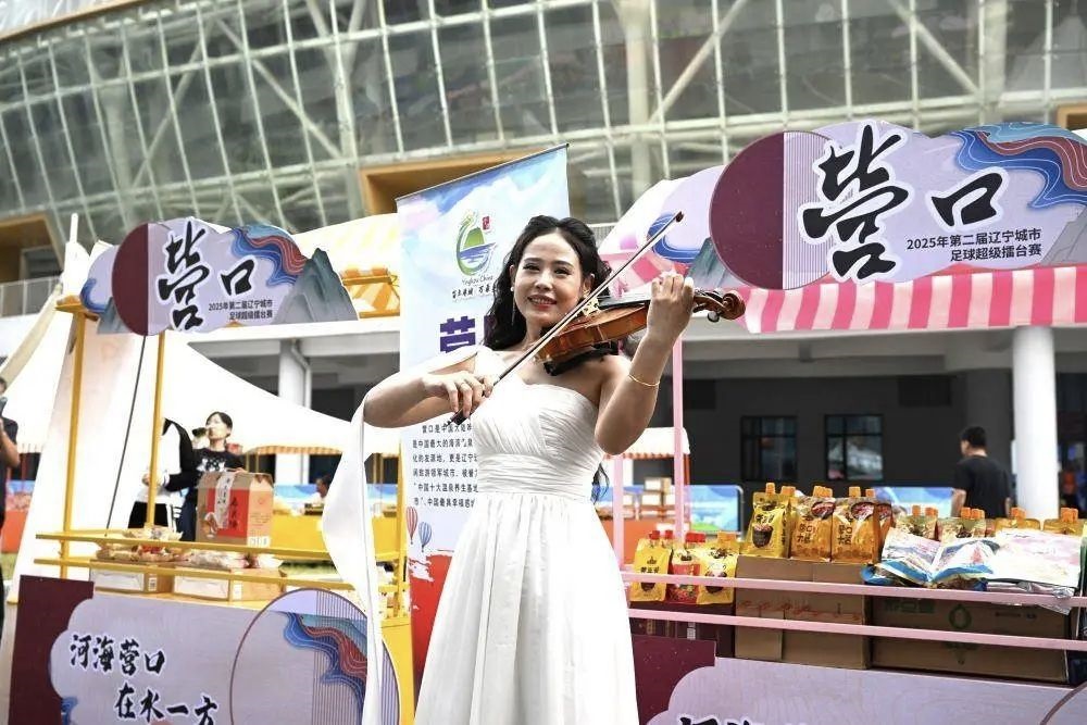 “辽超”场地旁,“辽超市集”营口摊位进行节目演出。